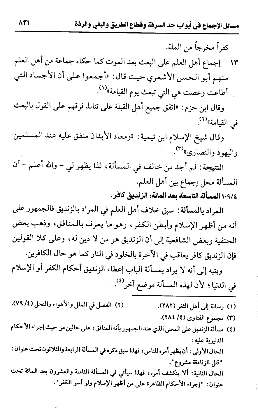 [109/ 4] المسألة التاسعة بعد المائة: الزنديق كافر.