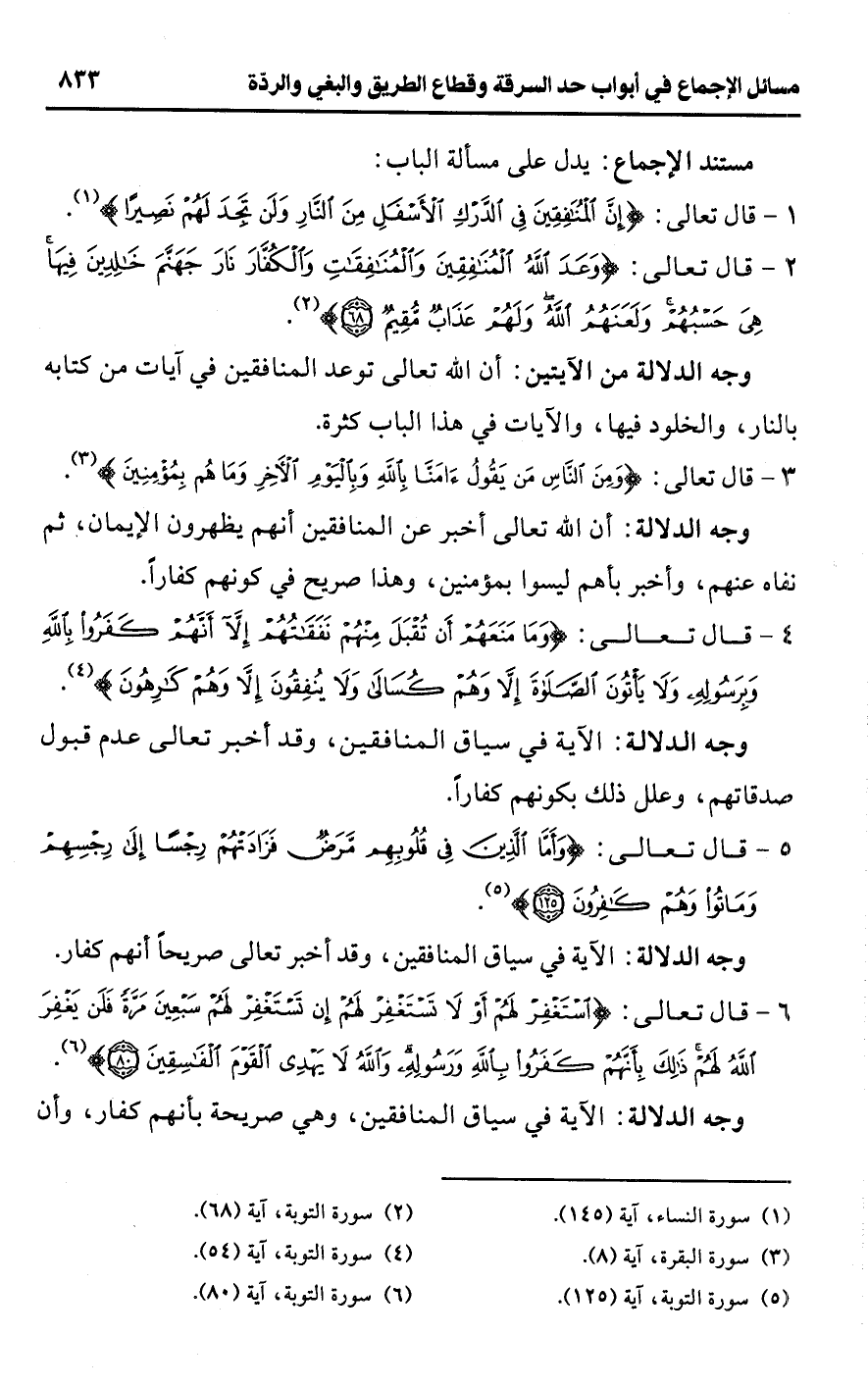 • وجه الدلالة من الآيتين: أن اللَّه تعالى توعد المنافقين في آيات من كتابه بالنار، والخلود فيها، والآيات في هذا الباب كثيرة.