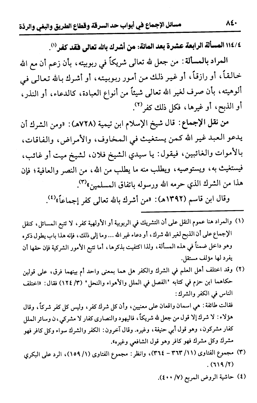 [114/ 4] المسألة الرابعة عشرة بعد المائة: من أشرك باللَّه تعالى فقد كفر (¬1).