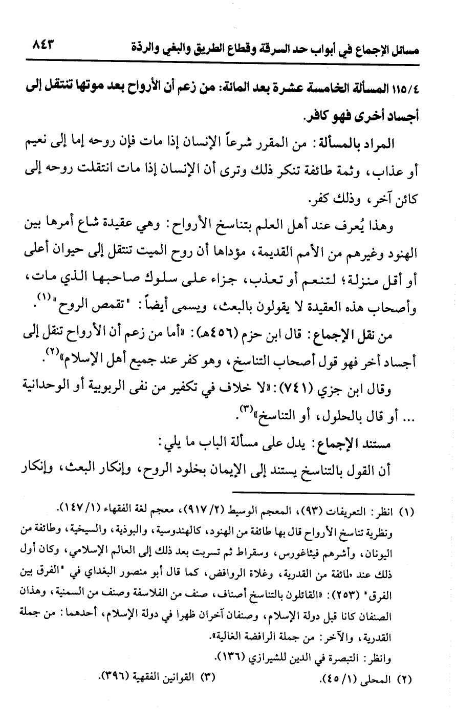 • من نقل الإجماع: قال ابن حزم (456 هـ): "أما من زعم أن الأرواح تنقل إلى أجساد أخر فهو قول أصحاب التناسخ، وهو كفر عند جميع أهل الإسلام" (¬2).