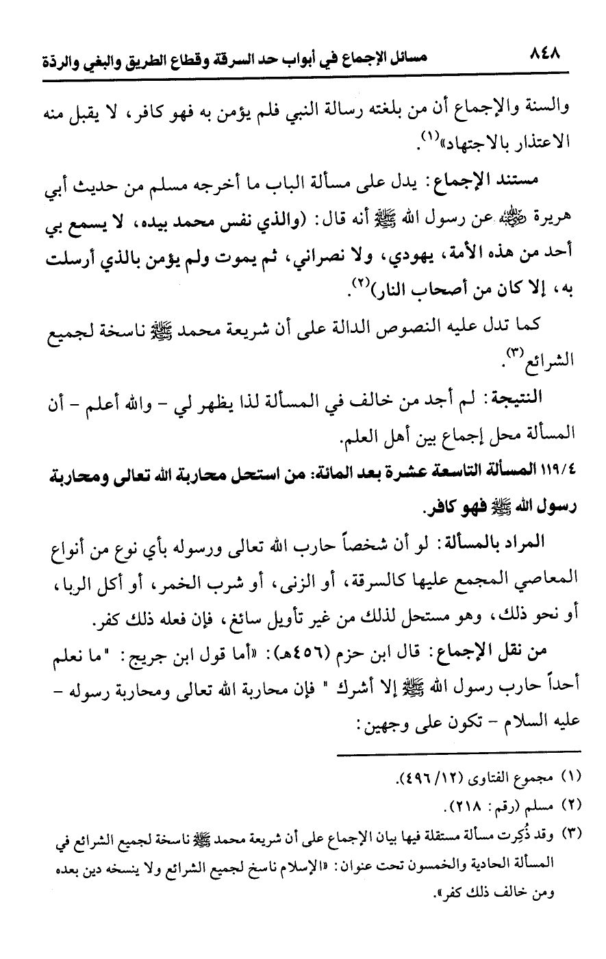 (¬3) وقد ذُكِرت مسألة مستقلة فيها بيان الإجماع على أن شريعة محمد -صلى اللَّه عليه وسلم- ناسخة لجميع الشرائع في المسألة الحادية والخمسون تحت عنوان: "الإسلام ناسخ لجميع الشرائع ولا ينسخه دين بعده ومن خالف ذلك كفر".