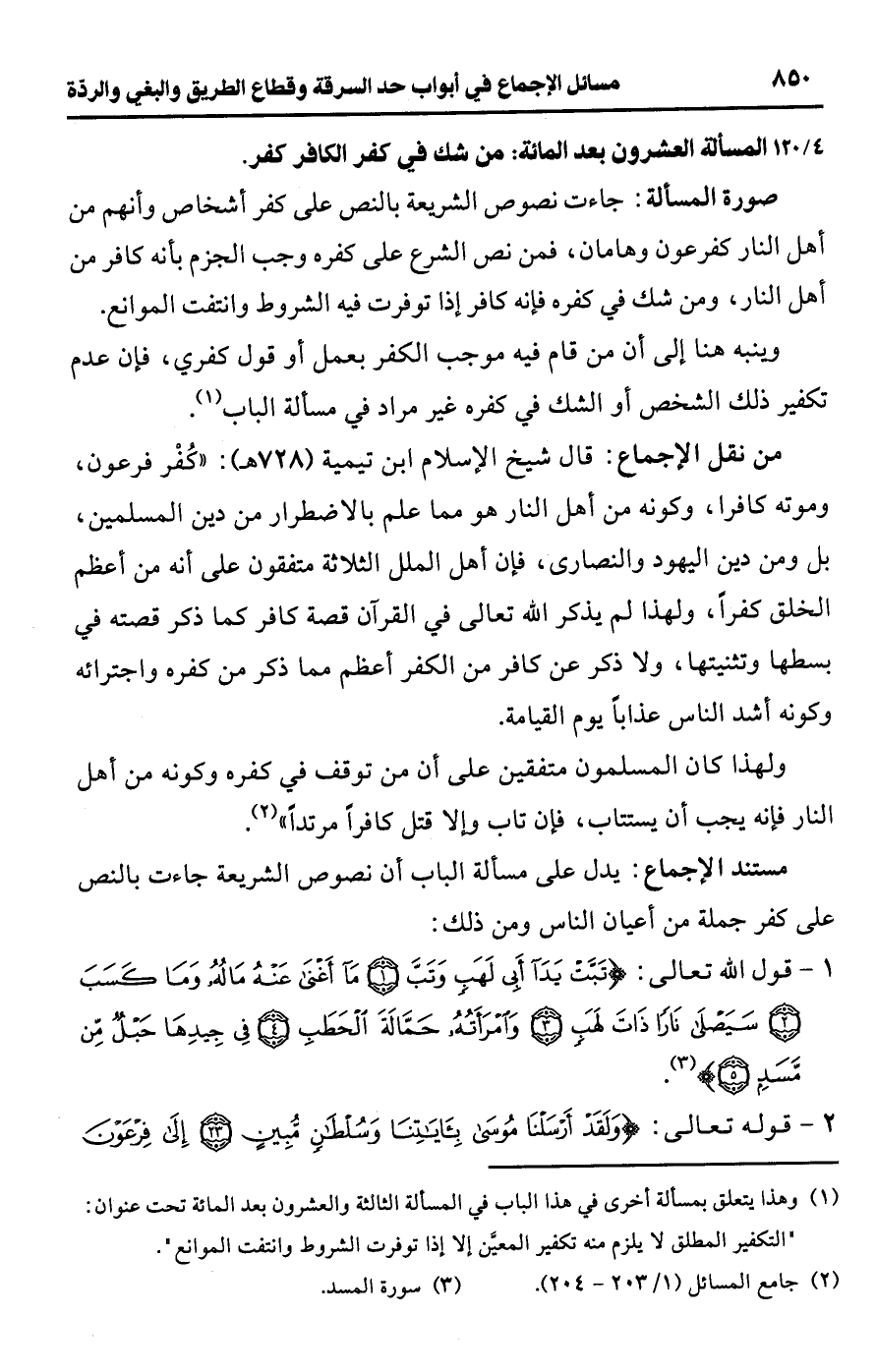 (¬1) وهذا يتعلق بمسألة أخرى في هذا الباب في المسألة الثالثة والعشرون بعد المائة تحت عنوان: "التكفير المطلق لا يلزم منه تكفير المعيَّن إلا إذا توفرت الشروط وانتفت الموانع".
