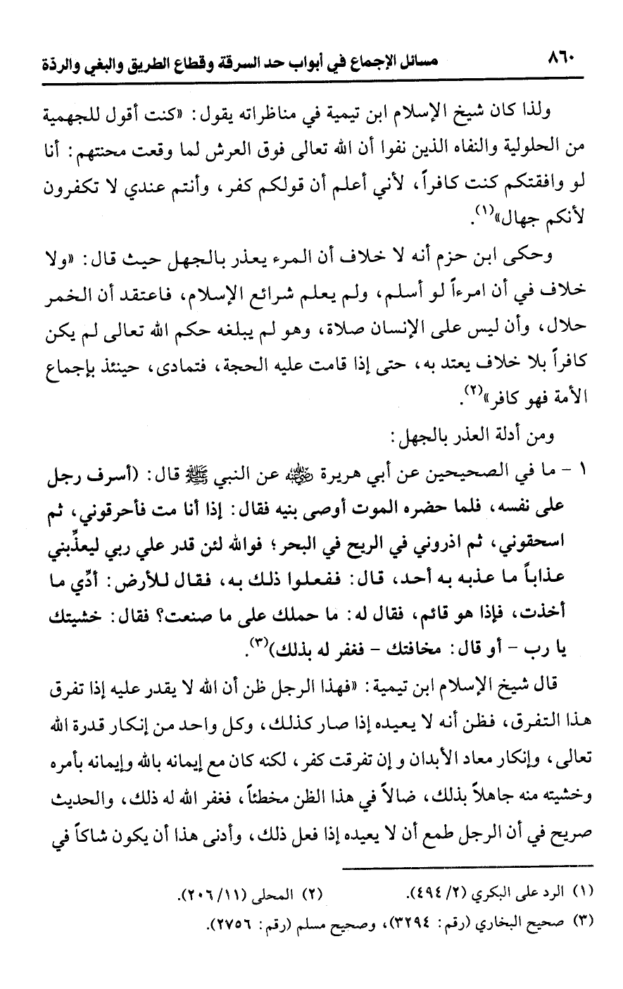 وحكى ابن حزم أنه لا خلاف أن المرء يعذر بالجهل حيث قال: "ولا خلاف في أن امرءًا لو أسلم، ولم يعلم شرائع الإسلام، فاعتقد أن الخمر حلال، وأن ليس على الإنسان صلاة، وهو لم يبلغه حكم اللَّه تعالى لم يكن كافرًا بلا خلاف يعتد به، حتى إذا قامت عليه الحجة، فتمادى، حينئذ بإجماع الأمة فهو كافر" (¬2).