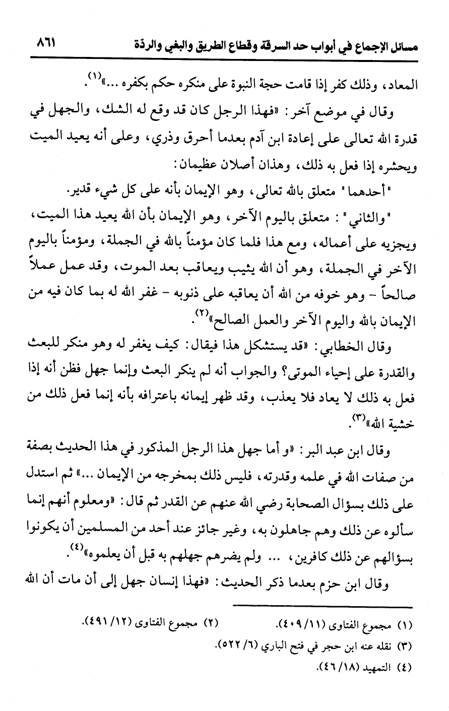 وقال ابن عبد البر: "وأما جهل هذا الرجل المذكور في هذا الحديث بصفة من صفات اللَّه في علمه وقدرته، فليس ذلك بمخرجه من الإيمان. . . " ثم استدل على ذلك بسؤال الصحابة رضي اللَّه عنهم عن القدر ثم قال: "ومعلوم أنهم إنما سألوه عن ذلك وهم جاهلون به، وغير جائز عند أحد من المسلمين أن يكونوا بسؤالهم عن ذلك كافرين، . . . ولم يضرهم جهلهم به قبل أن يعلموه" (¬4).