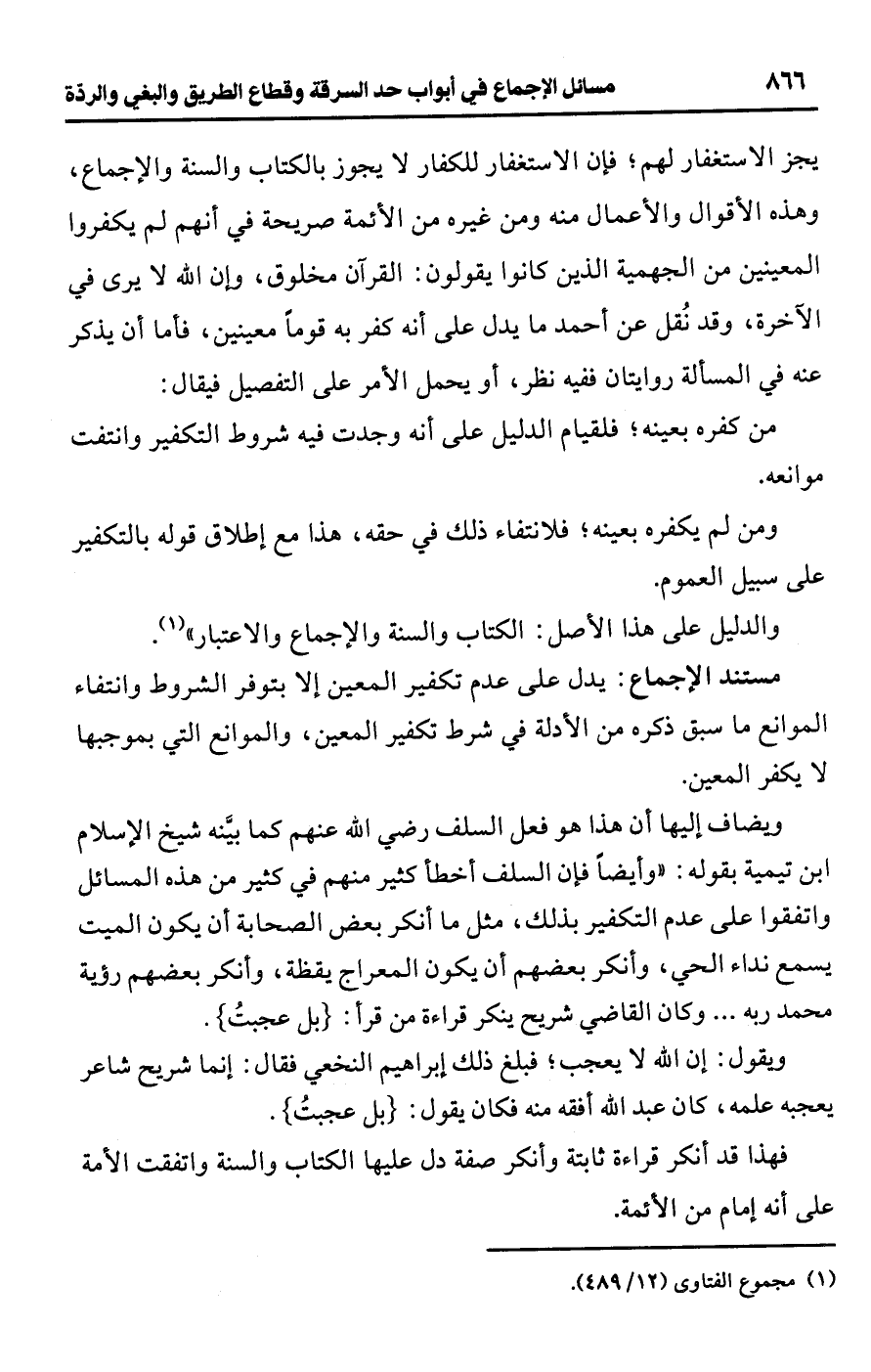 ويضاف إليها أن هذا هو فعل السلف رضي اللَّه عنهم كما بيَّنه شيخ الإسلام ابن تيمية بقوله: "وأيضًا فإن السلف أخطأ كثير منهم في كثير من هذه المسائل واتفقوا على عدم التكفير بذلك، مثل ما أنكر بعض الصحابة أن يكون الميت يسمع نداء الحي، وأنكر بعضهم أن يكون المعراج يقظة، وأنكر بعضهم رؤية محمد ربه. . . وكان القاضي شريح ينكر قراءة من قرأ: {بَلْ عَجِبْتَ}.