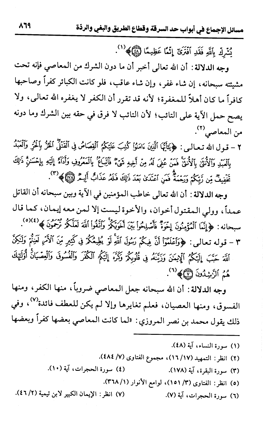 • وجه الدلالة: أن اللَّه سبحانه جعل المعاصي ضروبًا، منها الكفر، ومنها الفسوق، ومنها العصيان، فعلم تغايرها وإلا لم يكن للعطف فائدة (¬7)، وفي ذلك يقول محمد بن نصر المروزي: "لما كانت المعاصي بعضها كفرًا وبعضها