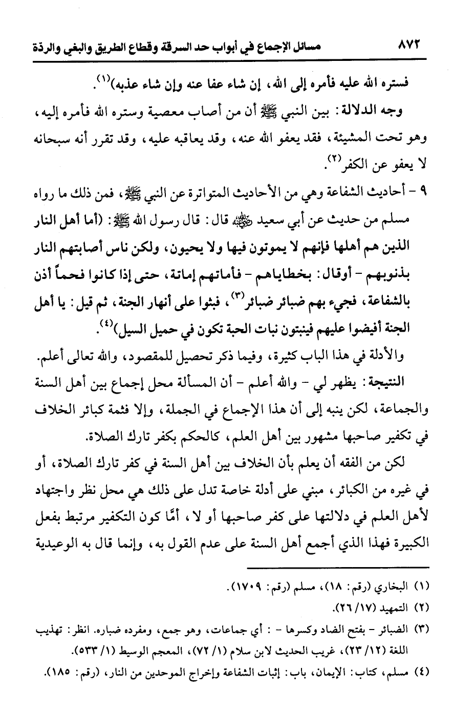 والأدلة في هذا الباب كثيرة، وفيما ذكر تحصيل للمقصود، واللَّه تعالى أعلم.Rيظهر لي -واللَّه أعلم- أن المسألة محل إجماع بين أهل السنة والجماعة، لكن ينبه إلى أن هذا الإجماع في الجملة، وإلا فثمة كبائر الخلاف في تكفير صاحبها مشهور بين أهل العلم، كالحكم بكفر تارك الصلاة.