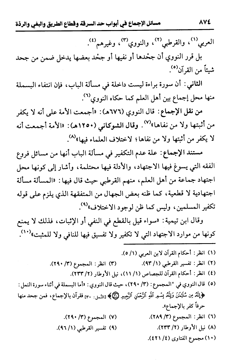 (¬5) قال النووي في "المجموع": (3/ 290)، حيث قال النووي: "أما البسملة في أثناء سورة النمل: {إِنَّهُ مِنْ سُلَيْمَانَ وَإِنَّهُ بِسْمِ اللَّهِ الرَّحْمَنِ الرَّحِيمِ (30)} [النمل: 30] فقرآن بالإجماع، فمن جحد منها حرفً كفر بالإجماع".