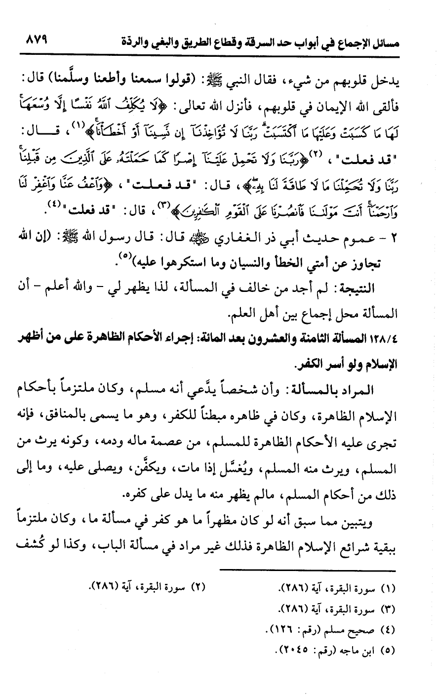 [128/ 4] المسألة الثامنة والعشرون بعد المائة: إجراء الأحكام الظاهرة على من أظهر الإسلام ولو أسر الكفر.