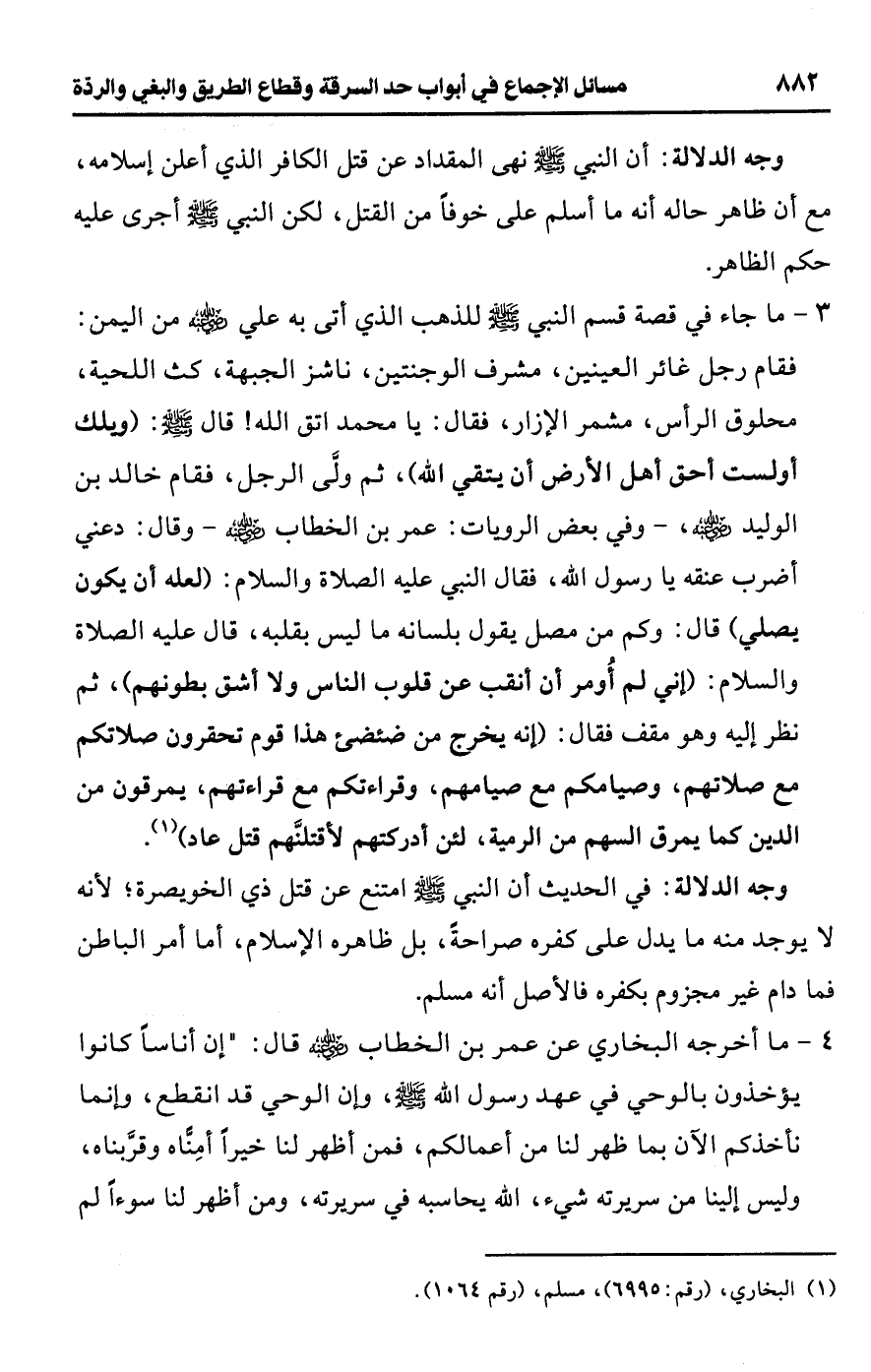 • وجه الدلالة: في الحديث أن النبي -صلى اللَّه عليه وسلم- امتنع عن قتل ذي الخويصرة؛ لأنه لا يوجد منه ما يدل على كفره صراحةً، بل ظاهره الإسلام، أما أمر الباطن فما دام غير مجزوم بكفره فالأصل أنه مسلم.