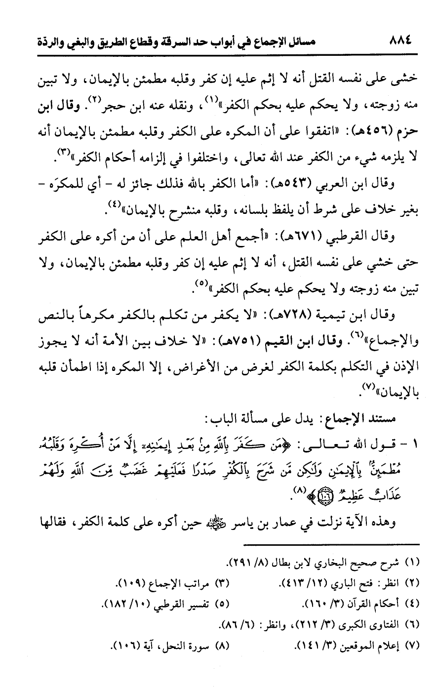 وقال القرطبي (671 هـ): "أجمع أهل العلم على أن من أكره على الكفر حتى خشي على نفسه القتل، أنه لا إثم عليه إن كفر وقلبه مطمئن بالإيمان، ولا تبين منه زوجته ولا يحكم عليه بحكم الكفر" (¬5).
