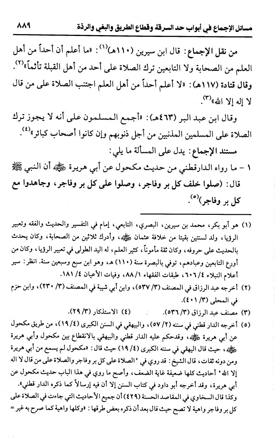 • من نقل الإجماع: قال ابن سيرين (110 هـ) (¬1): "ما أعلم أن أحدًا من أهل العلم من الصحابة ولا التابعين ترك الصلاة على أحد من أهل القبلة تأثمًا" (¬2). وقال قتادة (117 هـ): "لا أعلم أحدًا من أهل العلم اجتنب الصلاة على من قال لا إله إلا اللَّه" (¬3).
