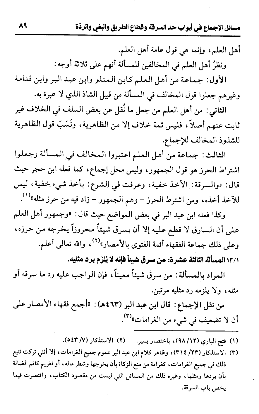 وكذا فعله ابن عبد البر في بعض المواضع حيث قال: "وجمهور أهل العلم على أن السارق لا قطع عليه إلا أن يسرق شيئًا محروزًا يخرجه من حرزه، وعلى ذلك جماعة الفقهاء أئمة الفتوى بالأمصار" (¬2)، واللَّه تعالى أعلم.