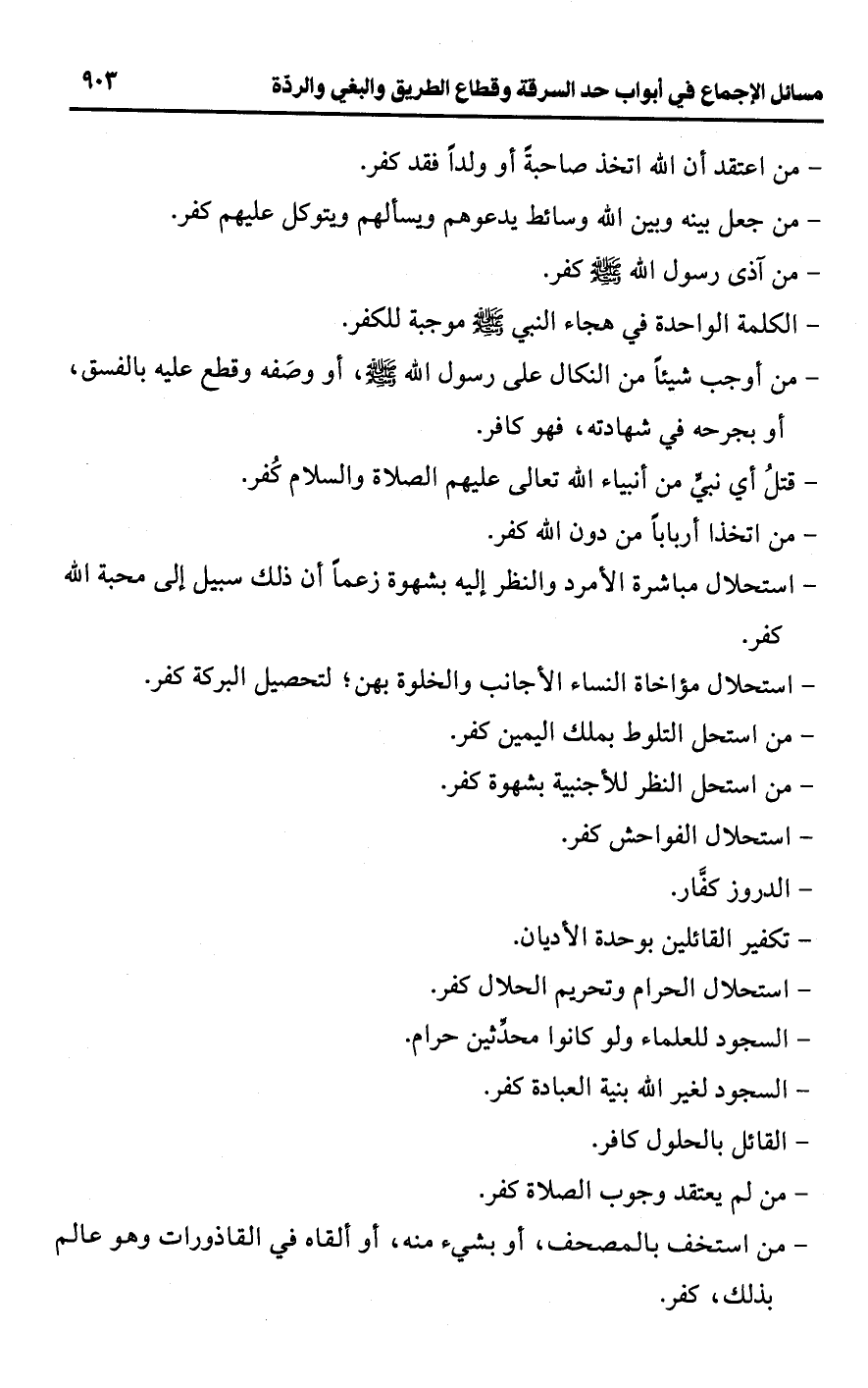 - من أوجب شيئًا من النكال على رسول اللَّه -صلى اللَّه عليه وسلم-، أو وصَفه وقطع عليه بالفسق، أو بجرحه في شهادته، فهو كافر.