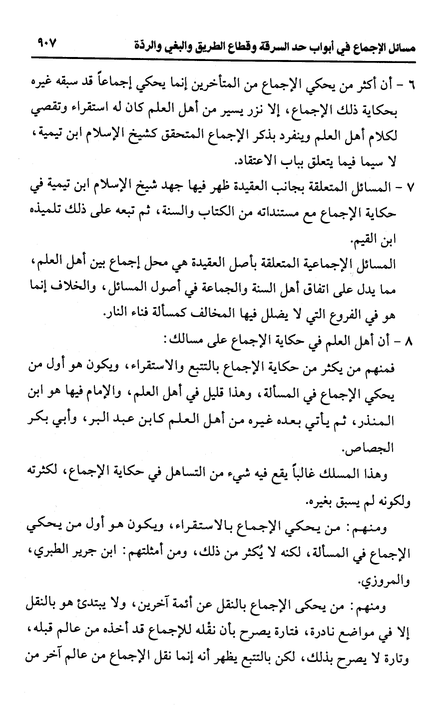 7 - المسائل المتعلقة بجانب العقيدة ظهر فيها جهد شيخ الإسلام ابن تيمية في حكاية الإجماع مع مستنداته من الكتاب والسنة، ثم تبعه على ذلك تلميذه ابن القيم.