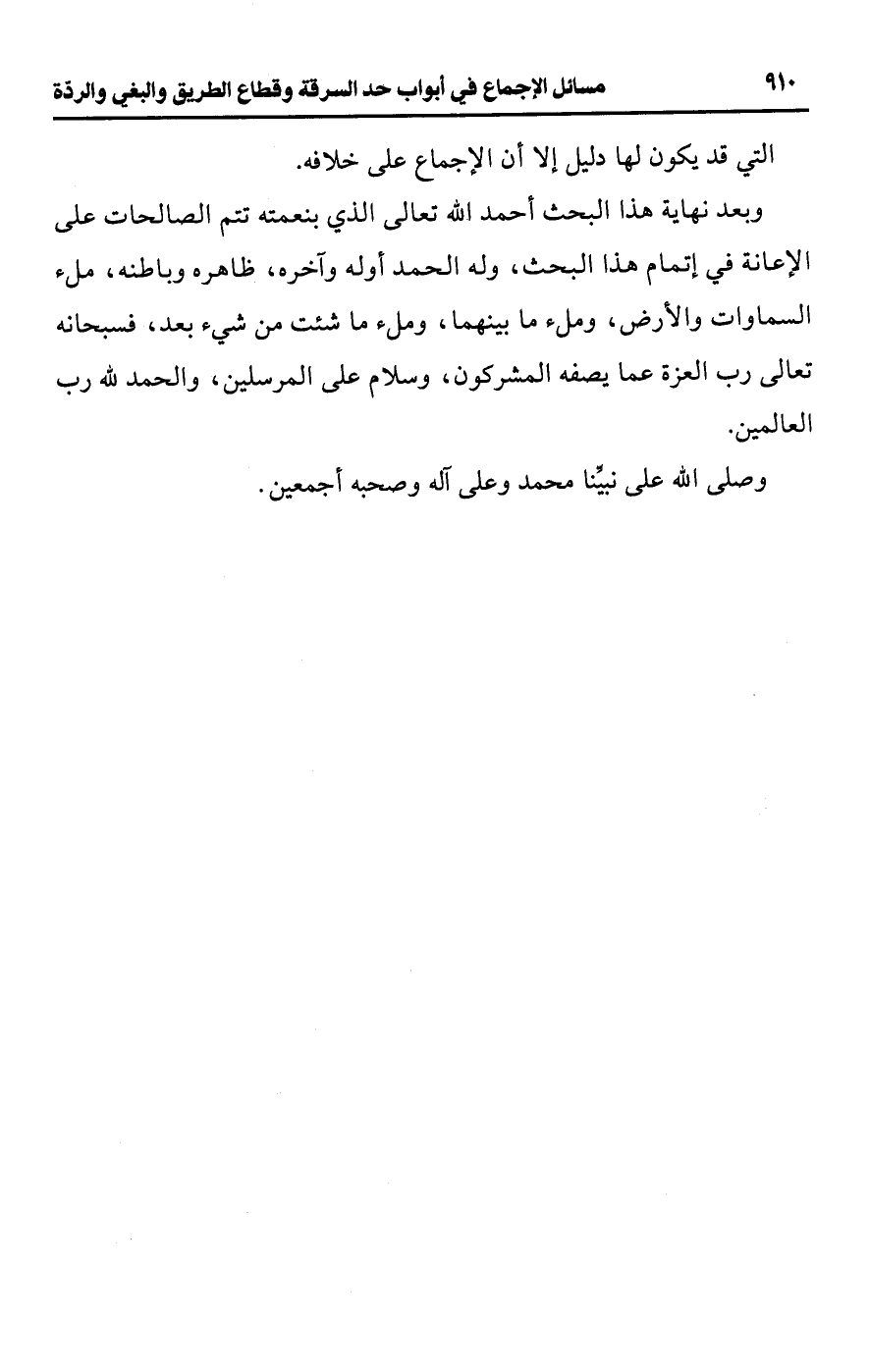 وبعد نهاية هذا البحث أحمد اللَّه تعالى الذي بنعمته تتم الصالحات على الإعانة في إتمام هذا البحث، وله الحمد أوله وآخره، ظاهره وباطنه، ملء السماوات والأرض، وملء ما بينهما، وملء ما شئت من شيء بعد، فسبحانه تعالى رب العزة عما يصفه المشركون، وسلام على المرسلين، والحمد للَّه رب العالمين.