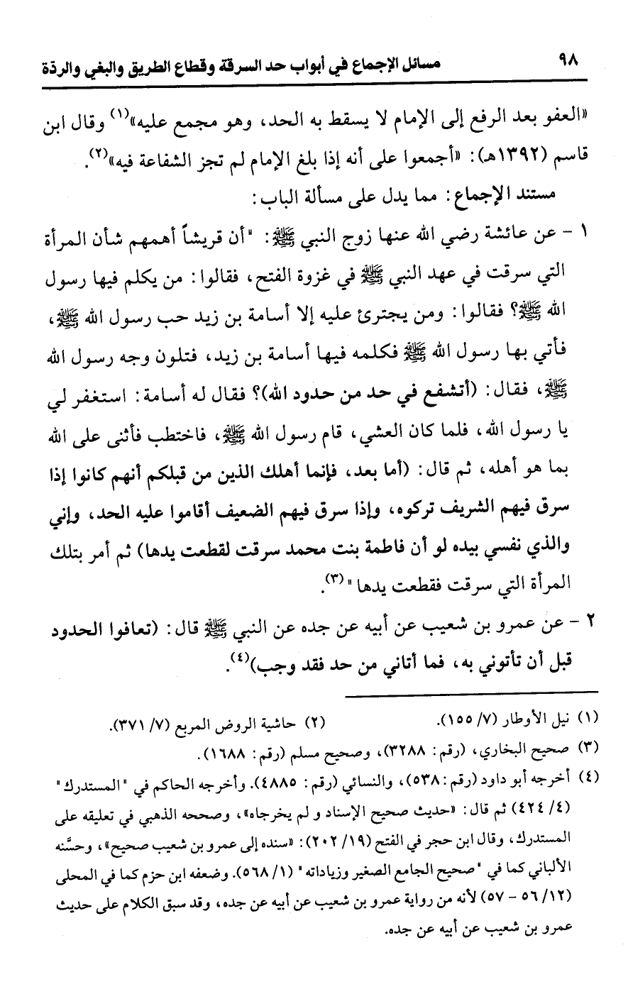 1 - عن عائشة رضي اللَّه عنها زوج النبي -صلى اللَّه عليه وسلم-: "أن قريشًا أهمهم شأن المرأة التي سرقت في عهد النبي -صلى اللَّه عليه وسلم- في غزوة الفتح، فقالوا: من يكلم فيها رسول اللَّه -صلى اللَّه عليه وسلم-؟ فقالوا: ومن يجترئ عليه إلا أسامة بن زيد حب رسول اللَّه -صلى اللَّه عليه وسلم-، فأتي بها رسول اللَّه -صلى اللَّه عليه وسلم- فكلمه فيها أسامة بن زيد، فتلون وجه رسول اللَّه -صلى اللَّه عليه وسلم-، فقال: (أتشفع في حد من حدود اللَّه)؟ فقال له أسامة: استغفر لي يا رسول اللَّه، فلما كان العشي، قام رسول اللَّه -صلى اللَّه عليه وسلم-، فاختطب فأثنى على اللَّه بما هو أهله، ثم قال: (أما بعد، فإنما أهلك الذين من قبلكم أنهم كانوا إذا سرق فيهم الشريف تركوه، وإذا سرق فيهم الضعيف أقاموا عليه الحد، وإني والذي نفسي بيده لو أن فاطمة بنت محمد سرقت لقطعت يدها) ثم أمر بتلك المرأة التي سرقت فقطعت يدها" (¬3).