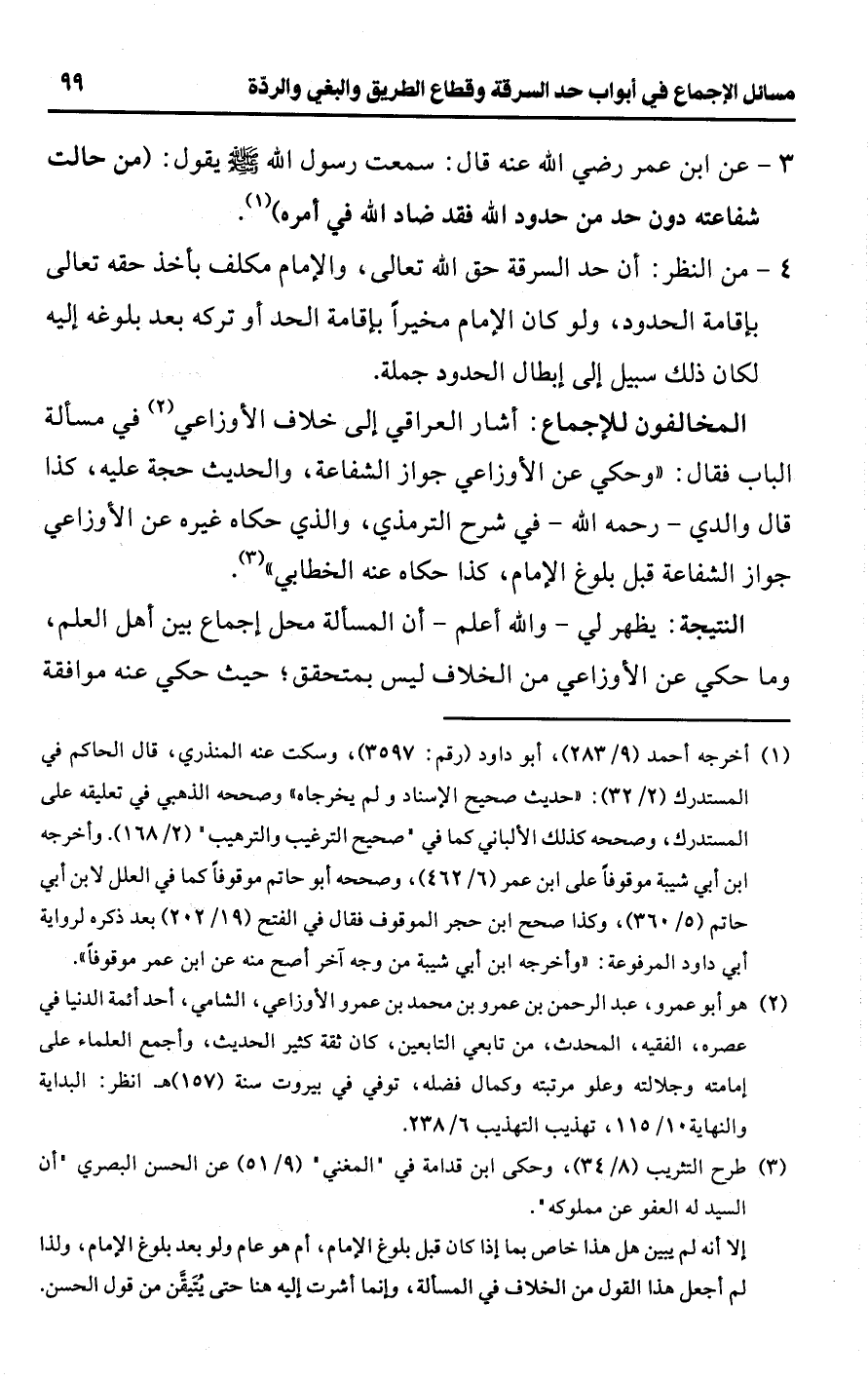 • المخالفون للإجماع: أشار العراقي إلى خلاف الأوزاعي (¬2) في مسألة الباب فقال: "وحكي عن الأوزاعي جواز الشفاعة، والحديث حجة عليه، كذا قال والدي -رحمه اللَّه- في شرح الترمذي، والذي حكاه غيره عن الأوزاعي جواز الشفاعة قبل بلوغ الإمام، كذا حكاه عنه الخطابي" (¬3).Rيظهر لي -واللَّه أعلم- أن المسألة محل إجماع بين أهل العلم، وما حكي عن الأوزاعي من الخلاف ليس بمتحقق؛ حيث حكي عنه موافقة