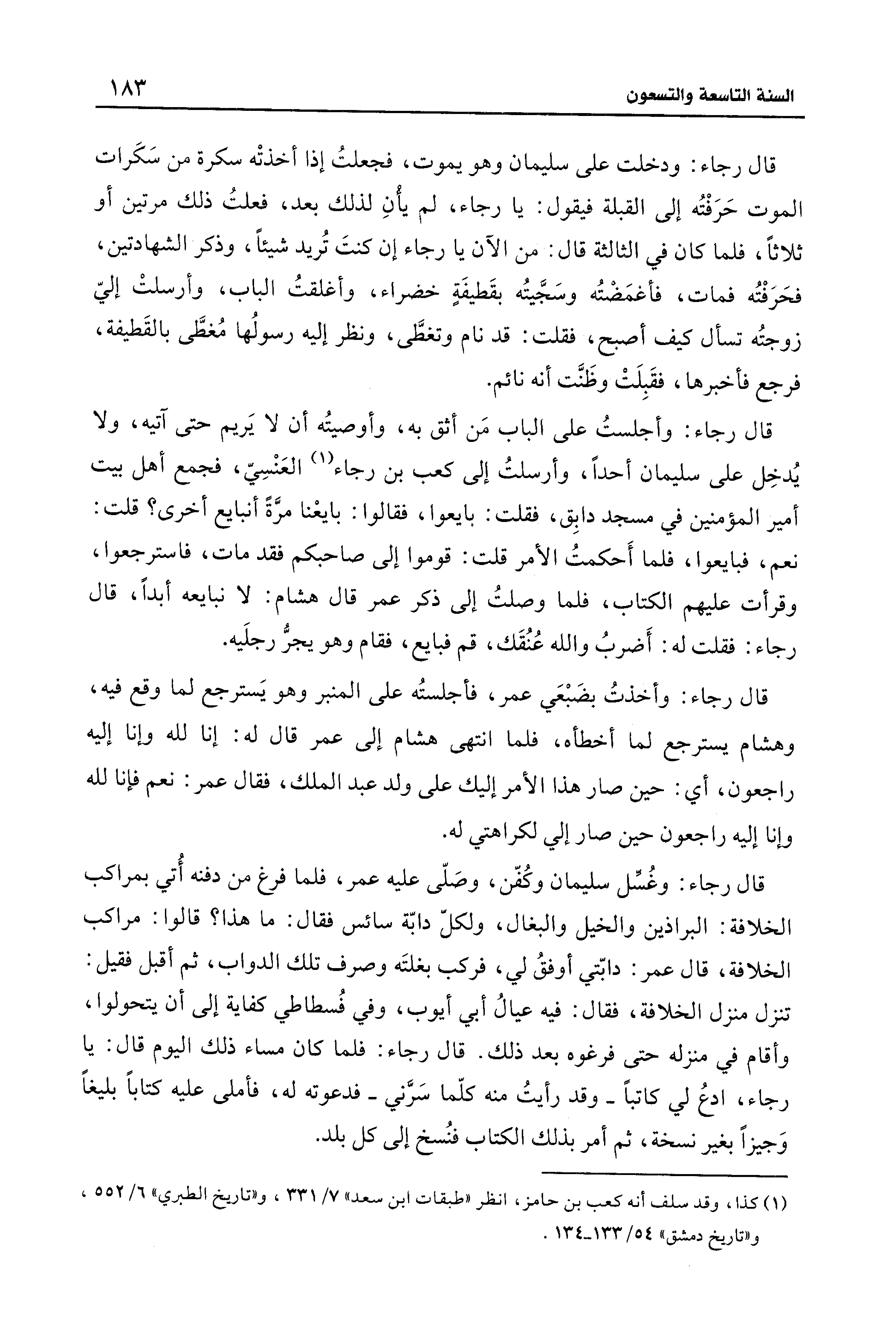 قال رجاء: وأجلستُ على الباب مَن أثق به، وأوصيتُه أن لا يَريم حتى آتيه، ولا يُدخِل على سليمان أحدًا، وأرسلتُ إلى كعب بن رجاء (¬1) العَنْسِيّ، فجمع أهل بيت أمير المؤمنين في مسجد دابِق، فقلت: بايعوا، فقالوا: بايعْنا مرَّةً أنبايع أخرى؟ قلت: نعم، فبايعوا، فلما أَحكمتُ الأمر قلت: قوموا إلى صاحبكم فقد مات، فاسترجعوا، وقرأت عليهم الكتاب، فلما وصلتُ إلى ذكر عمر قال هشام: لا نبايعه أبدًا، قال رجاء: فقلت له: أَضرب والله عُنُقَك، قم فبايع، فقام وهو يجرُّ رجلَيه.