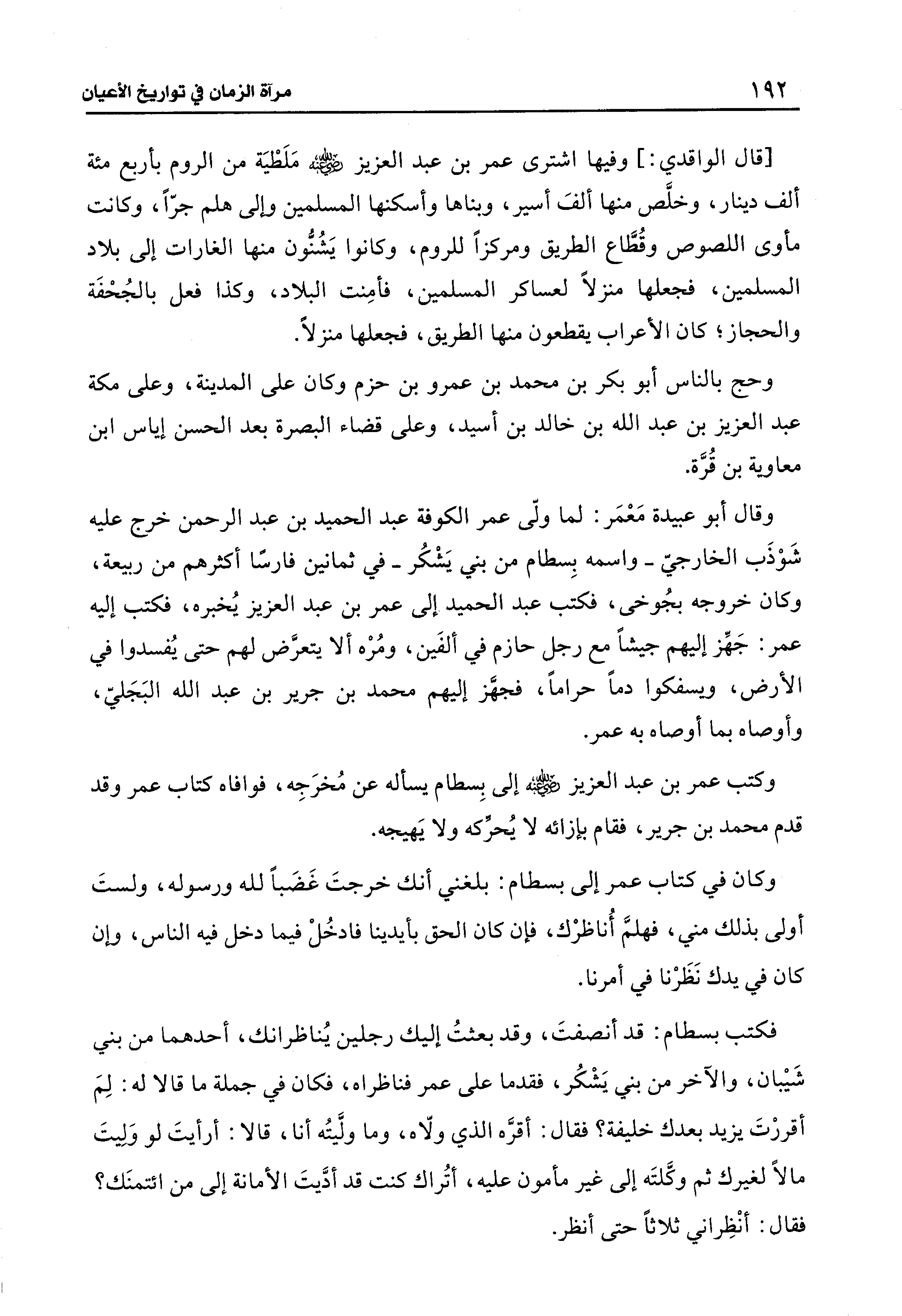 فكتب بسطام: قد أنصفتَ، وقد بعثتُ إليك رجلين يُناظرانك، أحدهما من بني شَيبان، والآخر من بني يَشْكُر، فقدما على عمر فناظراه، فكان في جملة ما قالا له: لِمَ أقررْتَ يزيد بعدك خليفة؟ فقال: أقرَّه الذي ولّاه، وما ولَّيتُه أنا، قالا: أرأيتَ لو وَلِيتَ مالًا لغيرك ثم وكَّلتَه إلى غير مأمون عليه، أتُراك كنت قد أدَّيتَ الأمانة إلى من ائتمنَك؟ فقال: أنْظِراني ثلاثًا حتى أنظر.