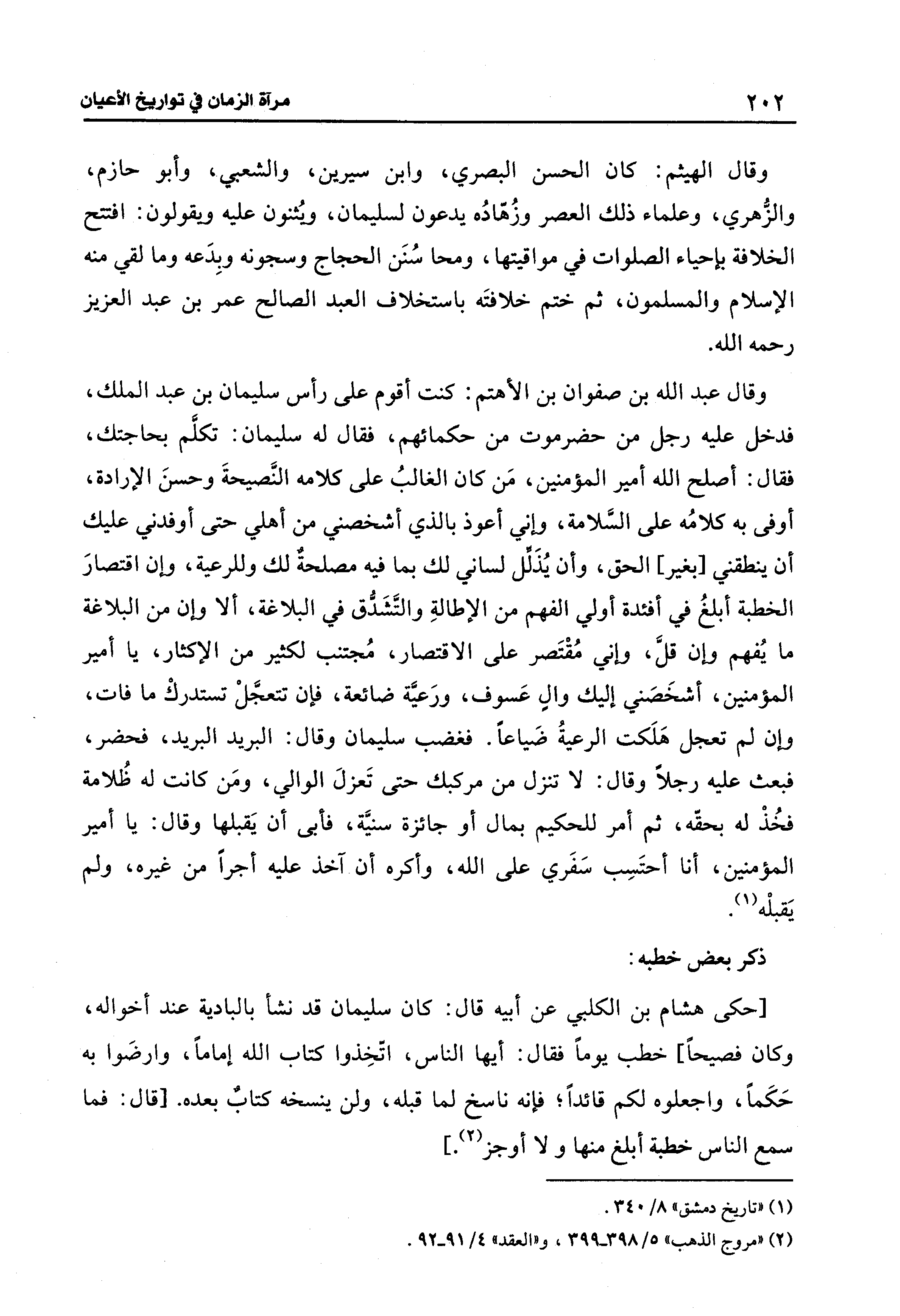 [حكى هشام بن الكلبي عن أبيه قال: كان سليمان قد نشأ بالبادية عند أخواله، وكان فصيحًا] خطب يومًا فقال: أيها الناس، اتّخِذوا كتاب الله إمامًا، وارضَوا به حَكَمًا، واجعلوه لكم قائدًا؛ فإنه ناسخ لما قبله، ولن ينسخه كتاب بعده. [قال: فما سمع الناس خطبة أبلغ منها ولا أوجز (¬2).]