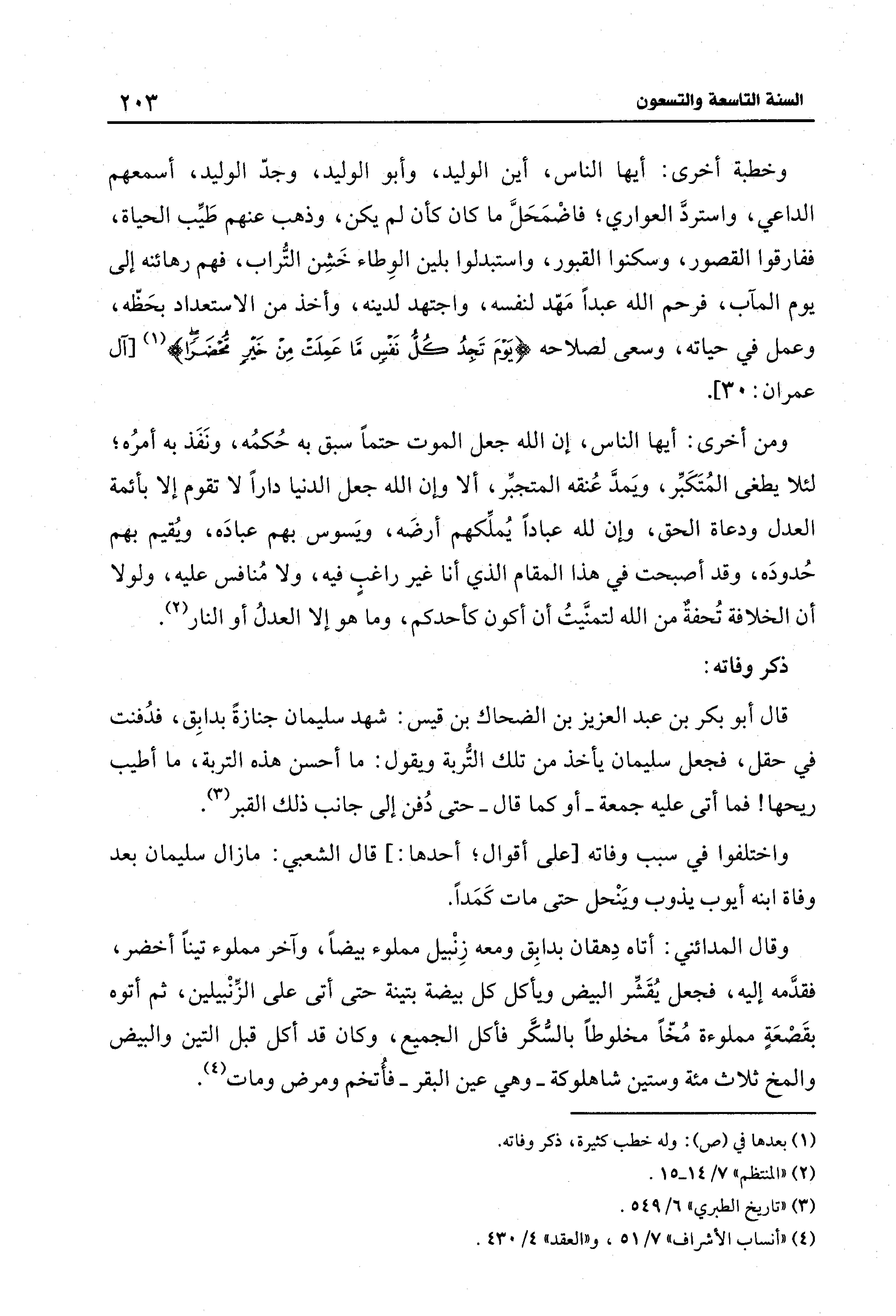 وخطبة أخرى: أيها الناس، أين الوليد، وأبو الوليد، وجدّ الوليد، أسمعهم الداعي، واسترد العواري؛ فاضمَحَلَّ ما كان كأن لم يكن، وذهب عنهم طَيِّب الحياة، ففارقوا القصور، وسكنوا القبور، واستبدلوا بلين الوطاء خَشِن التّواب، فهم رهائنه إلى يوم المآب، فرحم الله عبدًا مَهّد لنفسه، واجتهد لدينه، وأخذ من الاستعداد بحَظّه، وعمل في حياته، وسعى لصلاحه {يَوْمَ تَجِدُ كُلُّ نَفْسٍ مَا عَمِلَتْ مِنْ خَيرٍ مُحْضَرًا} [آل عمران: 30] (¬1).