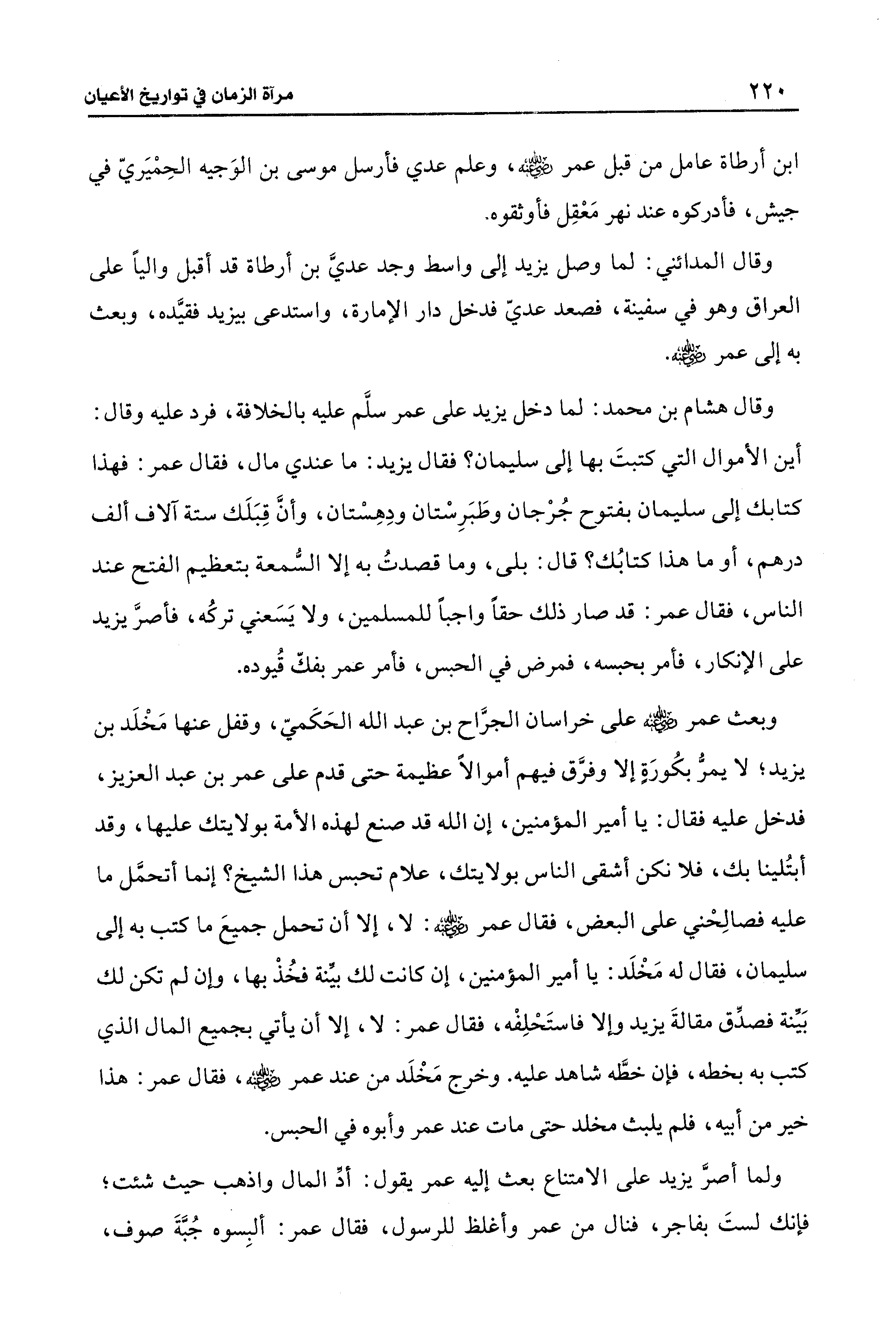 وقال هشام بن محمد: لما دخل يزيد على عمر سلَّم عليه بالخلافة، فرد عليه وقال: أين الأموال التي كتبتَ بها إلى سليمان؟ فقال يزيد: ما عندي مال، فقال عمر: فهذا كتابك إلى سليمان بفتوح جُرْجان وطَبَرِسْتان ودِهِسْتان، وأنَّ قِبَلَك ستة آلاف ألف درهم، أو ما هذا كتابُك؟ قال: بلى، وما قصدتُ به إلَّا السُّمعة بتعظيم الفتح عند النَّاس، فقال عمر: قد صار ذلك حقًّا واجبًا للمسلمين، ولا يَسَعني تركُه، فأصرَّ يزيد على الإنكار، فأمر بحبسه، فمرض في الحبس، فأمر عمر بفكّ قُيوده.