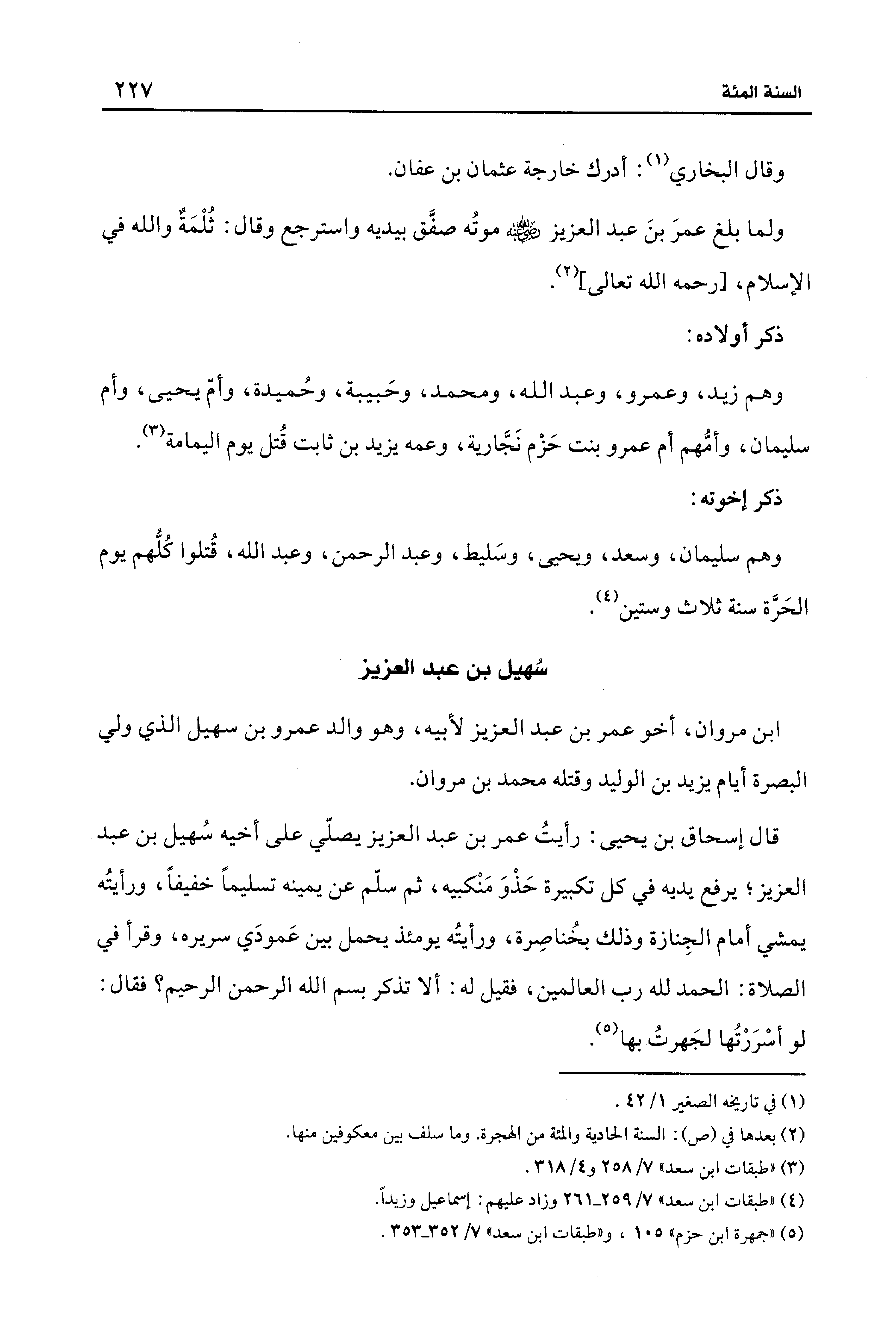 قال إسحاق بن يَحْيَى: رأيتُ عمر بن عبد العزيز يصلّي على أخيه سُهيل بن عبد العزيز؛ يرفع يديه في كل تكبيرة حَذْوَ مَنْكبيه، ثم سلّم عن يمينه تسليمًا خفيفًا، ورأيتُه يمشي أمام الجِنازة وذلك بخُناصِرة، ورأيتُه يومئذٍ يحمل بين عَمودَي سريره، وقرأ في الصَّلاة: الحمد لله رب العالمين، فقيل له: ألا تذكّر بِسْمِ اللَّهِ الرَّحْمَنِ الرَّحِيمِ؟ فقال: لو أسرَرْتُها لجَهرتُ بها (¬5).