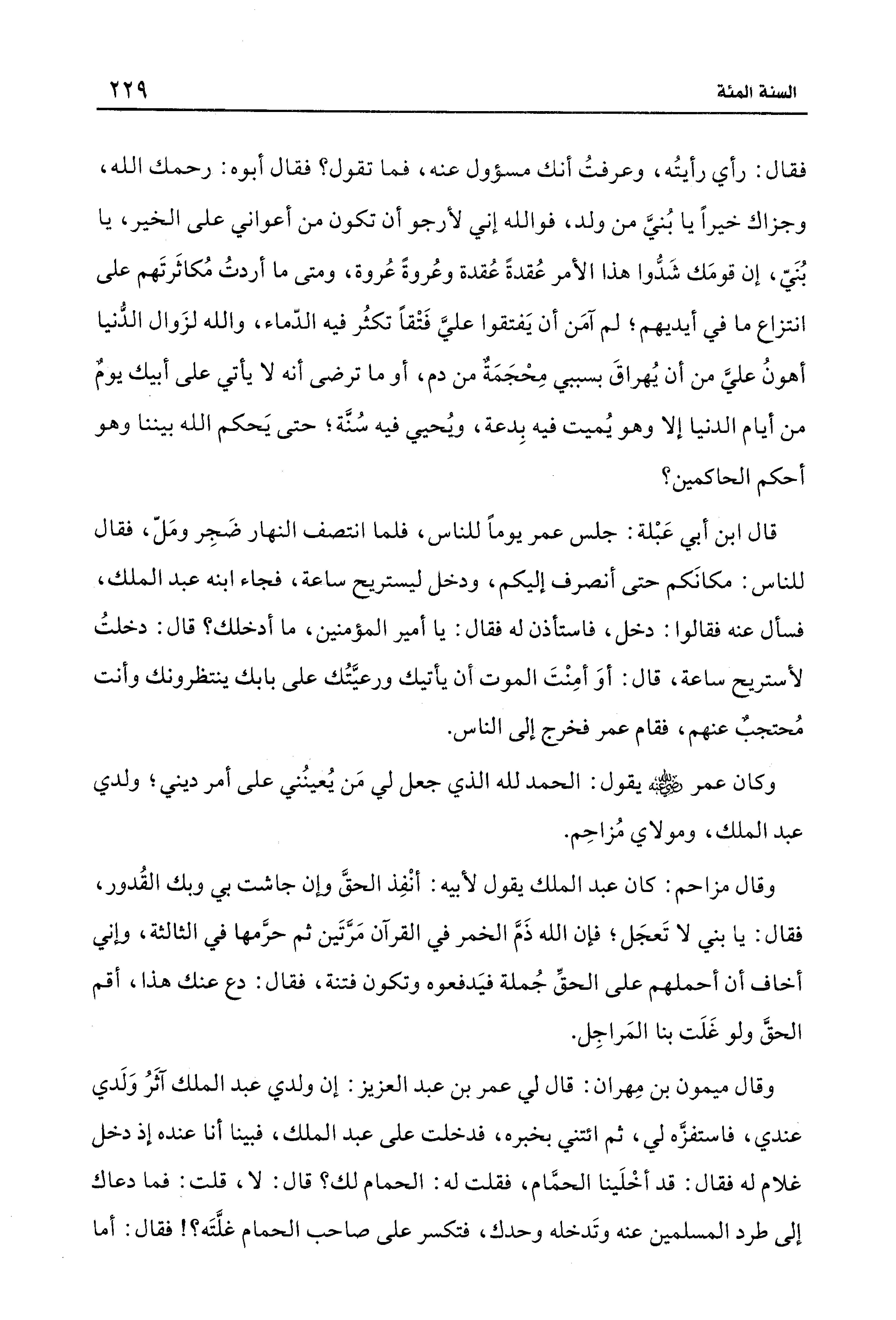 فقال: رأي رأيتُه، وعرفتُ أنك مسؤول عنه، فما تقول؟ فقال أبوه: رحمك الله، وجزاك خيرًا يا بُنيَّ من ولد، فوالله إنِّي لأرجو أن تكون من أعواني على الخير، يا بُنَيّ، إن قومَك شَدُّوا هذا الأمر عُقدةً عُقدة وعُروةً عُروة، ومتى ما أردتُ مُكاثَرتَهم على انتزاع ما في أيديهم؛ لم آمَن أن يَفتقوا عليَّ فَتْقًا تكثُر فيه الدّماء، والله لزَوال الدُّنيا أهونُ عليَّ من أن يُهراقَ بسببي مِحْجَمَةٌ من دم، أو ما ترضى أنَّه لا يأتي على أبيك يومٌ من أيَّام الدُّنيا إلَّا وهو يُميت فيه بِدعة، ويُحيي فيه سُنَّة؛ حتَّى يَحكم الله بيننا وهو أحكم الحاكمين؟