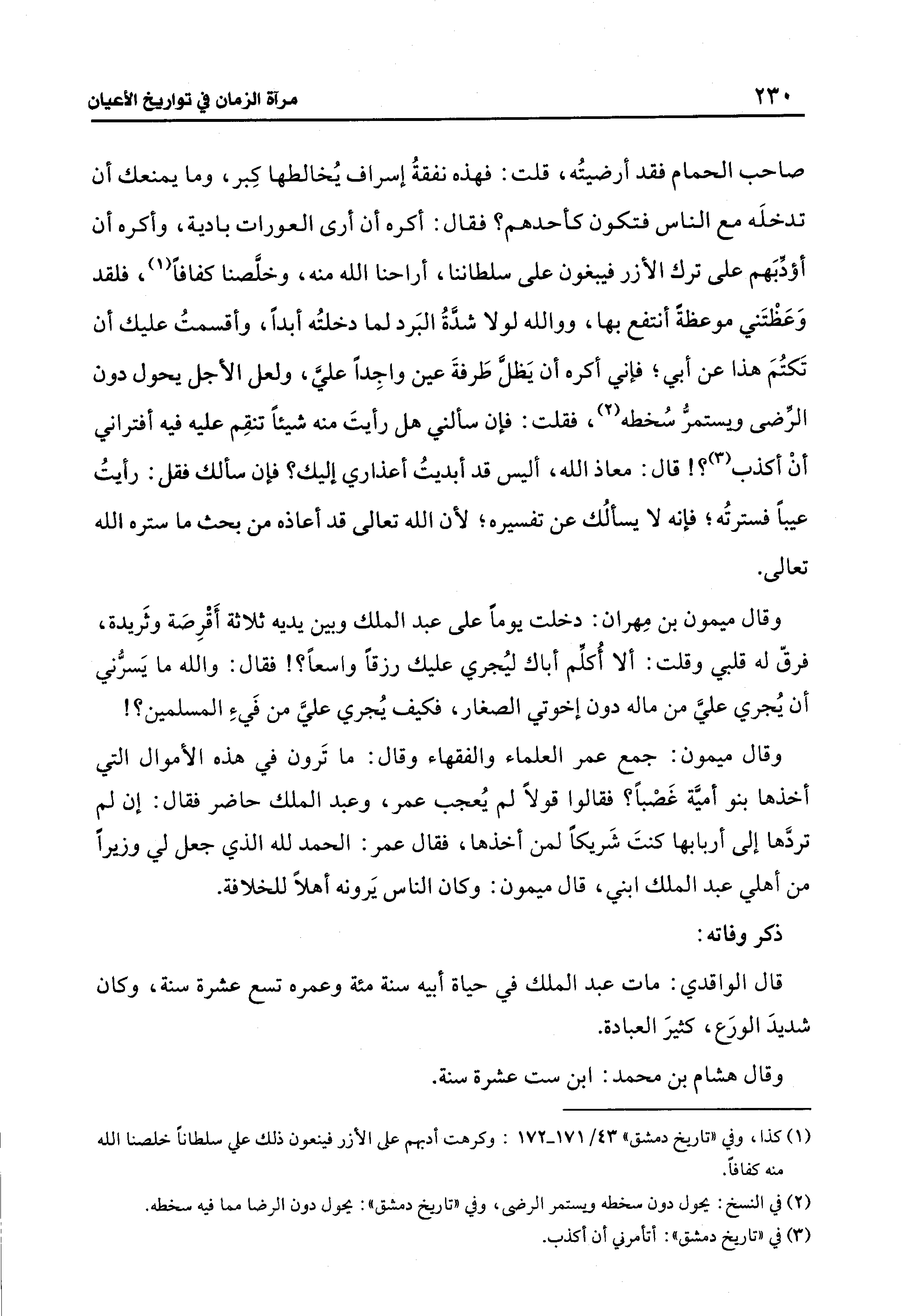 صاحب الحمام فقد أرضيتُه، قلت: فهذه نفقةُ إسراف يُخالطها كِبر، وما يمنعك أن تدخلَه مع النَّاس فتكون كأحدهم؟ فقال: أكره أن أرى العورات بادية، وأكره أن أؤدِّبَهم على ترك الأزر فيبغون على سلطاننا، أراحنا الله منه، وخلَّصنا كفافًا (¬1)، فلقد وَعَظْتَني موعظةً أنتفع بها، ووالله لولا شدَّةُ البَرد لما دخلتُه أبدًا، وأقسمتُ عليك أن تَكتُمَ هذا عن أبي؛ فإني أكره أن يَظلَّ طَرفةَ عين واجِدًا عليَّ، ولعل الأجل يحول دون الرِّضى ويستمرُّ سُخطه (¬2)، فقلت: فإن سألني هل رأيتَ منه شيئًا تنقِم عليه فيه أفتراني أنْ أكذب (¬3)؟ ! قال: معاذ الله، أليس قد أبديتُ أعذاري إليك؟ فإن سألك فقل: رأيتُ عيبًا فسترتُه؛ فإنَّه لا يسألُك عن تفسيره؛ لأنَّ الله تعالى قد أعاذه من بحث ما ستره الله تعالى.