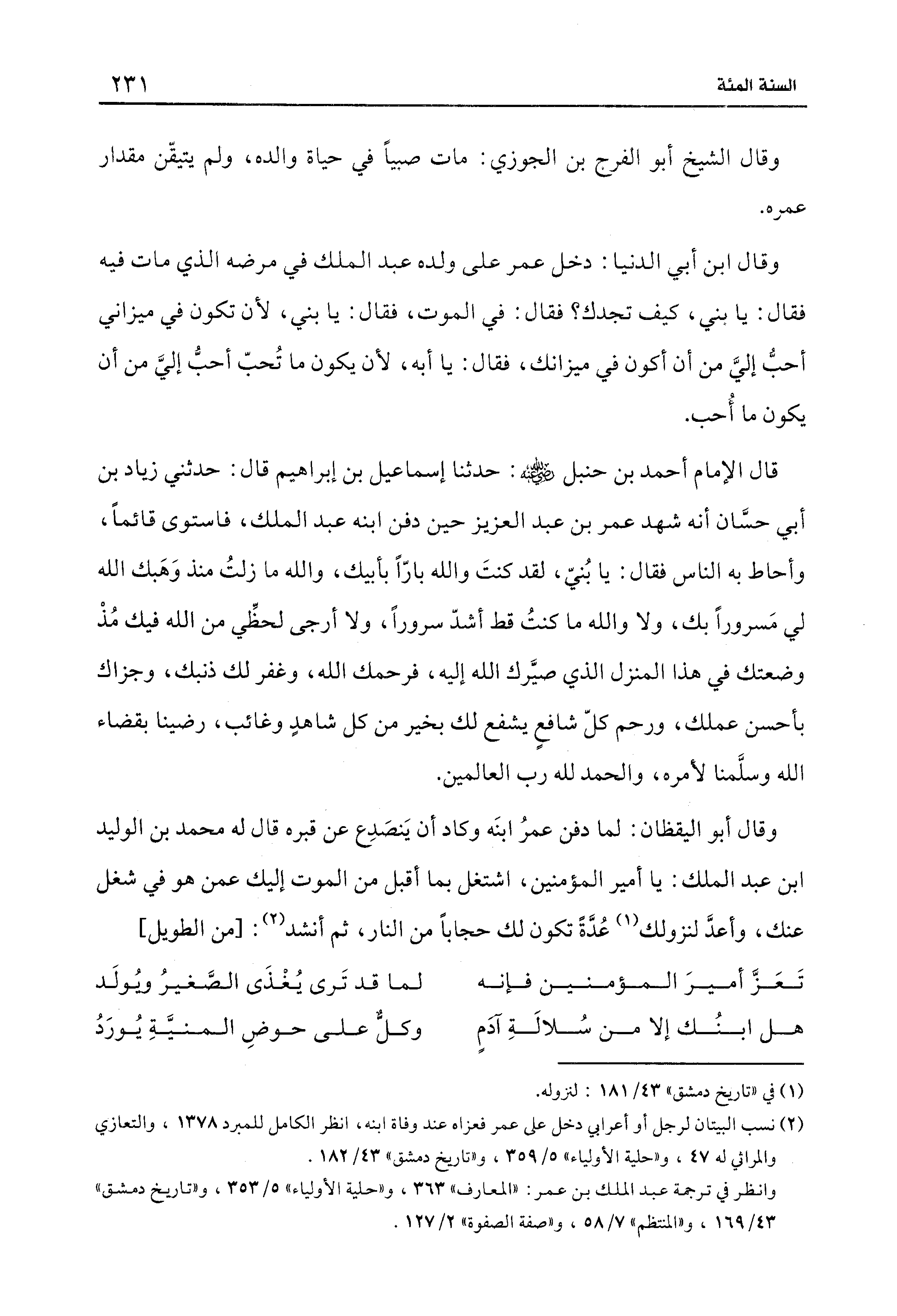 قال الإمام أحمد بن حنبل - رضي الله عنه -: حدَّثنا إسماعيل بن إبراهيم قال: حدثني زياد بن أبي حسَّان أنَّه شهد عمر بن عبد العزيز حين دفن ابنه عبد الملك، فاستوى قائمًا، وأحاط به النَّاس فقال: يا بُنيّ، لقد كنتَ والله بارًّا بأبيك، والله ما زلتُ منذ وَهَبك الله لي مَسرورًا بك، ولا والله ما كنتُ قط أشدّ سرورًا، ولا أرجى لحظِّي من الله فيك مُذْ وضعتك في هذا المنزل الذي صيرك الله إليه، فرحمك الله، وغفر لك ذنبك، وجزاك بأحسن عملك، ورحم كلّ شافعٍ يشفع لك بخير من كل شاهدٍ وغائب، رضينا بقضاء الله وسلَّمنا لأمره، والحمد لله رب العالمين.