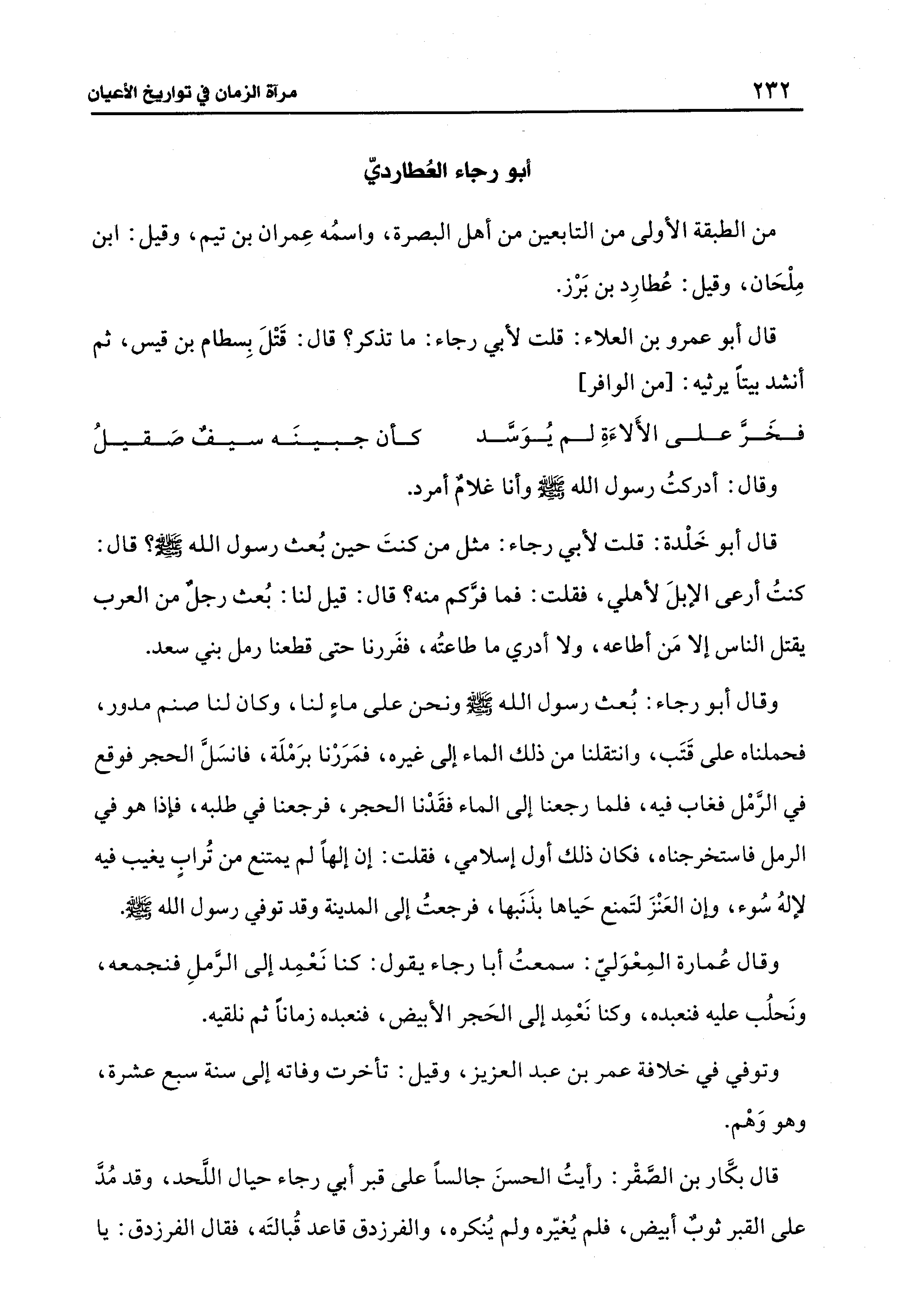 قال أبو عمرو بن العلاء: قلت لأبي رجاء: ما تذكّر؟ قال: قَتْلَ بِسطام بن قيس، ثم أنشد بيتًا يرثيه: [من الوافر]
