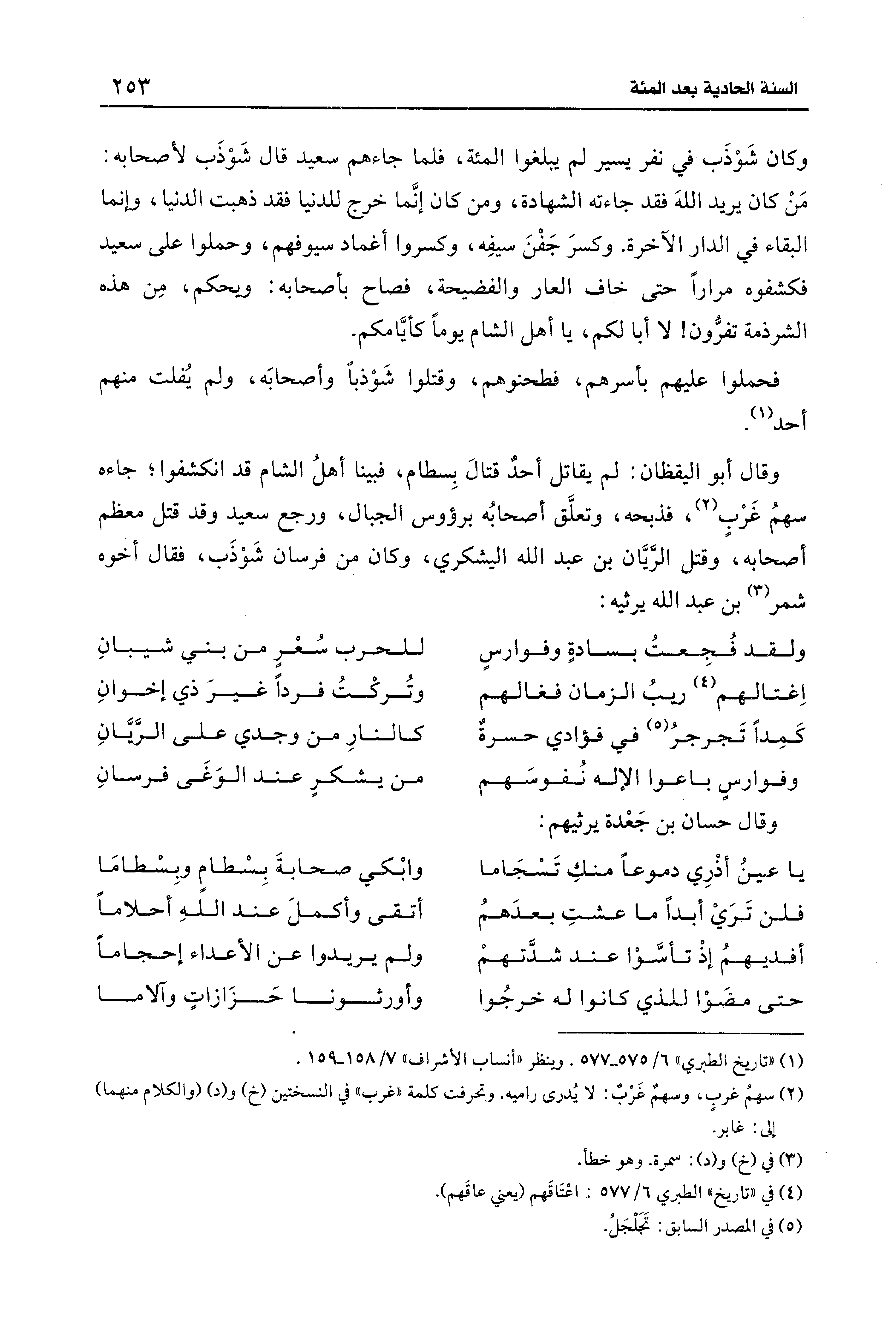 وقال أبو اليقظان: لم يقاتل أحدٌ قتال بِسطام، فبينا أهلُ الشام قد انكشفوا؛ جاءه سهمُ غرْبٍ (¬2)، فذبحه، وتعلَّق أصحابُه برؤوس الجبال، ورجع سعيد وقد قتل معظم أصحابه، وقتل الرَّيَّان بن عبد الله اليشكري، وكان من فرسان شَوْذَب، وقال أخوه شمر (¬3) بن عبد الله يرثيه: