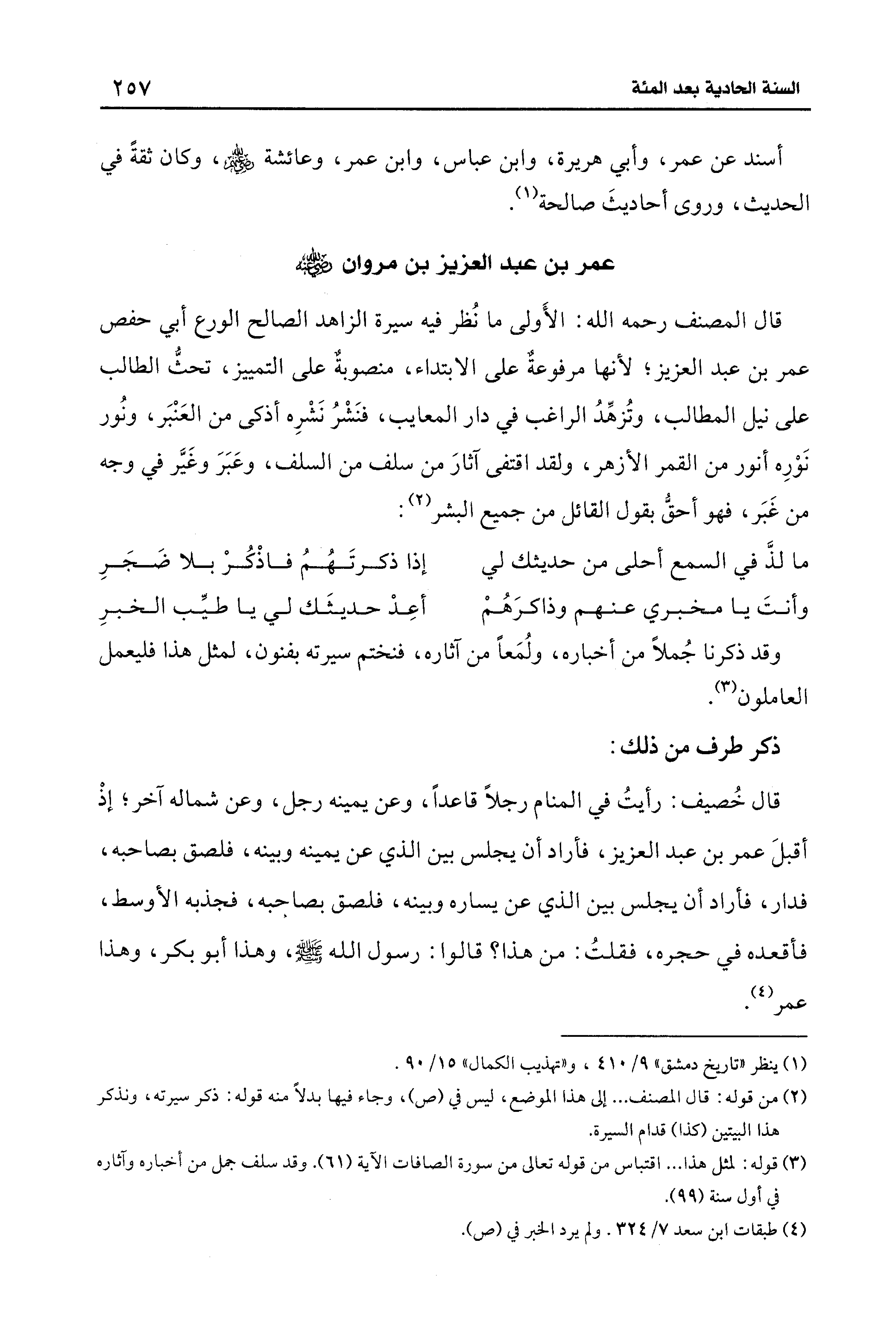 قال المصنف رحمه الله: الأَولى ما نُظر فيه سيرة الزاهد الصالح الورع أبي حفص عمر بن عبد العزيز؛ لأنها مرفوعةٌ على الابتداء، منصوبةٌ على التمييز، تحثُّ الطالب على نيل المطالب، وتُزهِّدُ الراغب في دار المعايب، فنَشْرُ نَشْرِه أذكى من العَنْبَر، ونُور نَوْرِه أنور من القمر الأزهر، ولقد اقتفى آثارَ من سلف من السلف، وعَبَرَ وغَيَّر في وجه من غَبَر، فهو أحقُّ بقول القائل من جميع البشر (¬2):