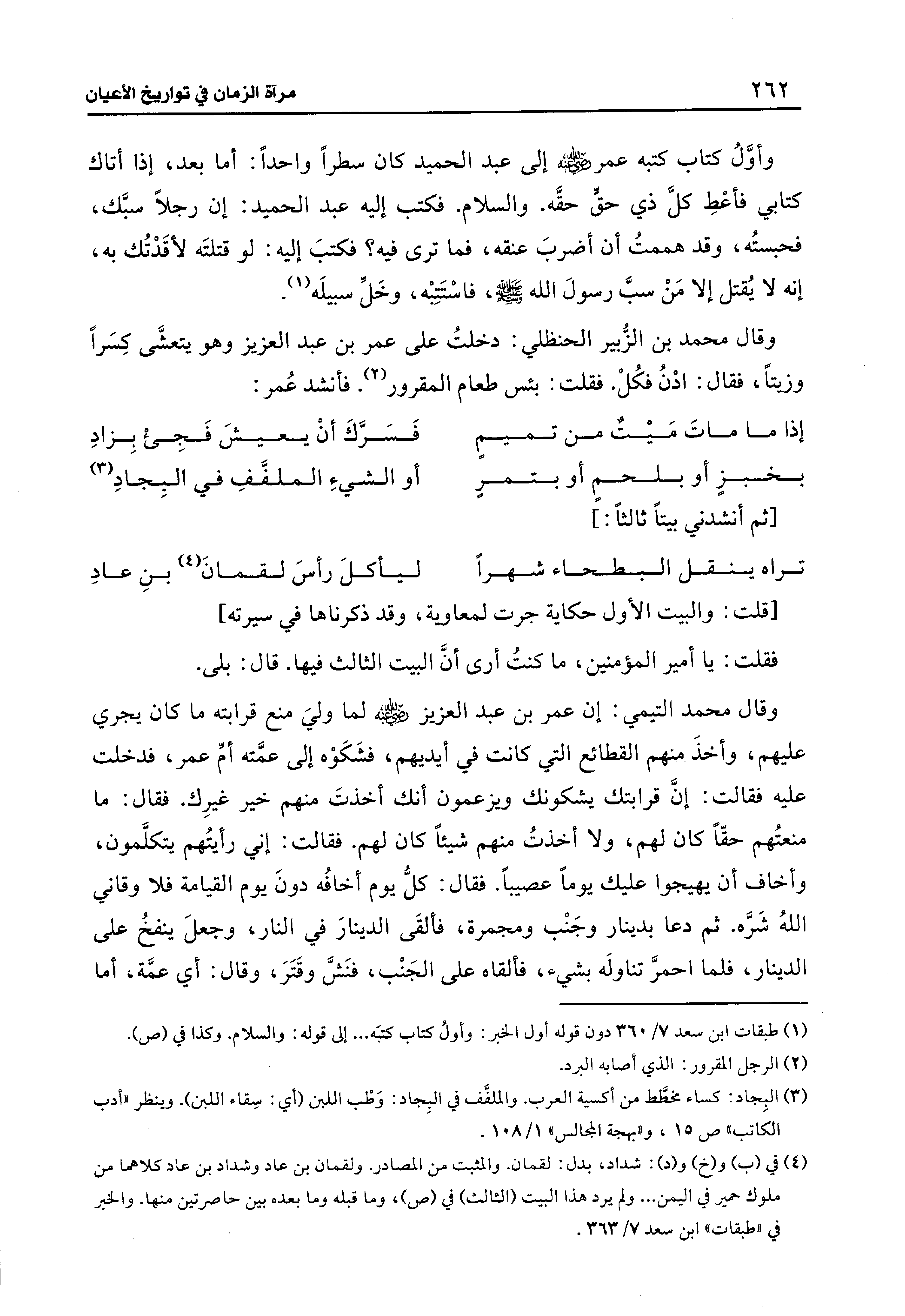 وأوَّلُ كتاب كتبه عمر - رضي الله عنه - إلى عبد الحميد كان سطرًا واحدًا: أما بعد، إذا أتاك كتابي فأعْطِ كل ذي حق حقَّه. والسلام. فكتب إليه عبد الحميد: إن رجلًا سبَّك، فحبستُه، وقد هممتُ أن أضربَ عنقه، فما ترى فيه؟ فكتبَ إليه: لو قتلتَه لأقَدْتُك به، إنه لا يُقتل إلا مَنْ سبَّ رسولَ الله - صلى الله عليه وسلم -، فاسْتَتِبْه، وخَلِّ سبيلَه (¬1).