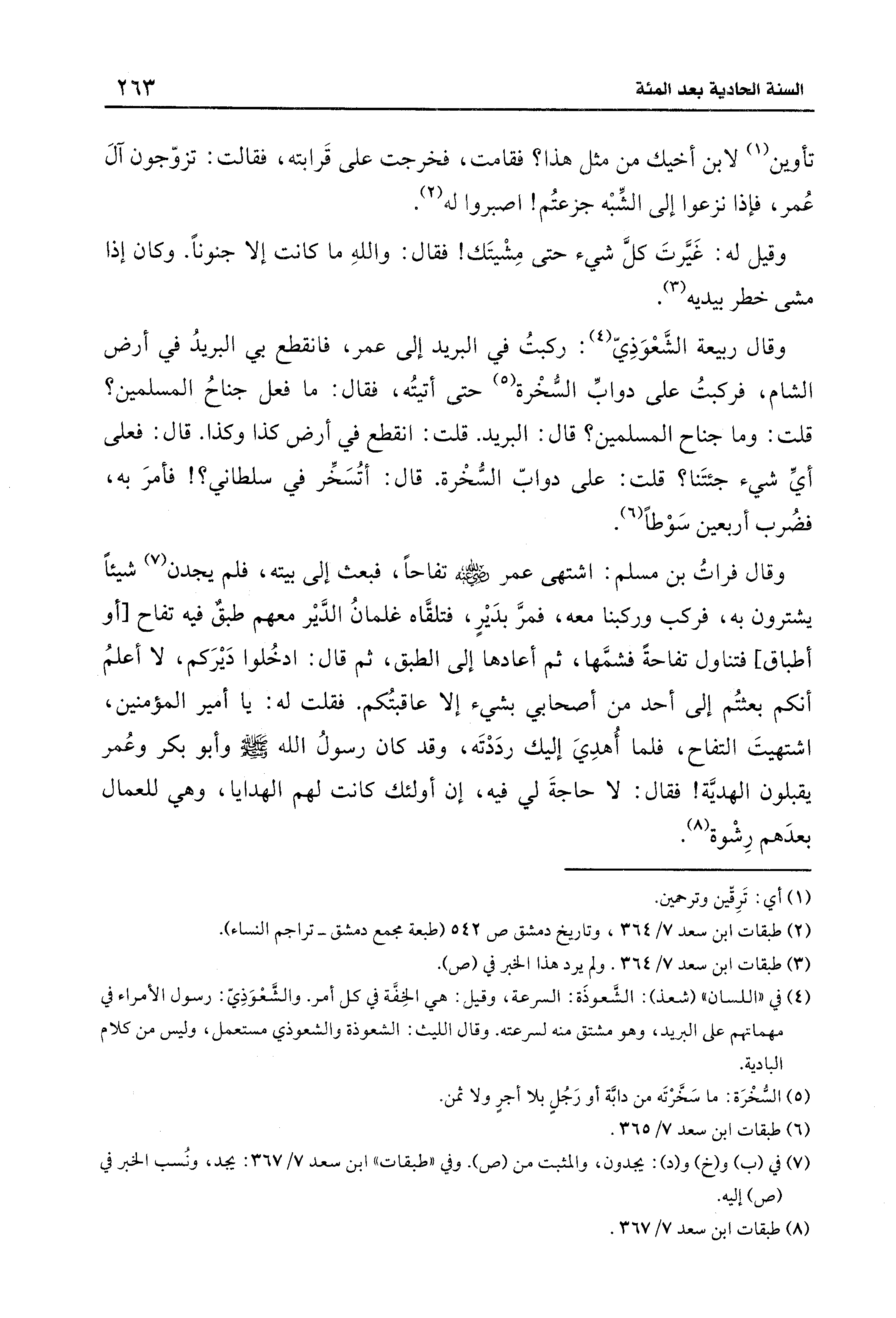 وقال ربيعة الشَّعْوَذِيّ (¬4): ركبتُ في البريد إلى عمر، فانقطع بي البريدُ في أرض الشام، فركبتُ على دوابِّ السُّخْرة (¬5) حتَّى أتيتُه، فقال؛ ما فعلى جناحُ المسلمين؟ قلت: وما جناح المسلمين؟ قال: البريد. قلت: انقطع في أرض كذا وكذا. قال: فعلى أيِّ شيء جئتَنا؟ قلت: على دوابّ السُّخْرة. قال: أتُسَخِّر في سلطاني؟ ! فأمرَ به، فضُرب أربعين سَوْطًا (¬6).