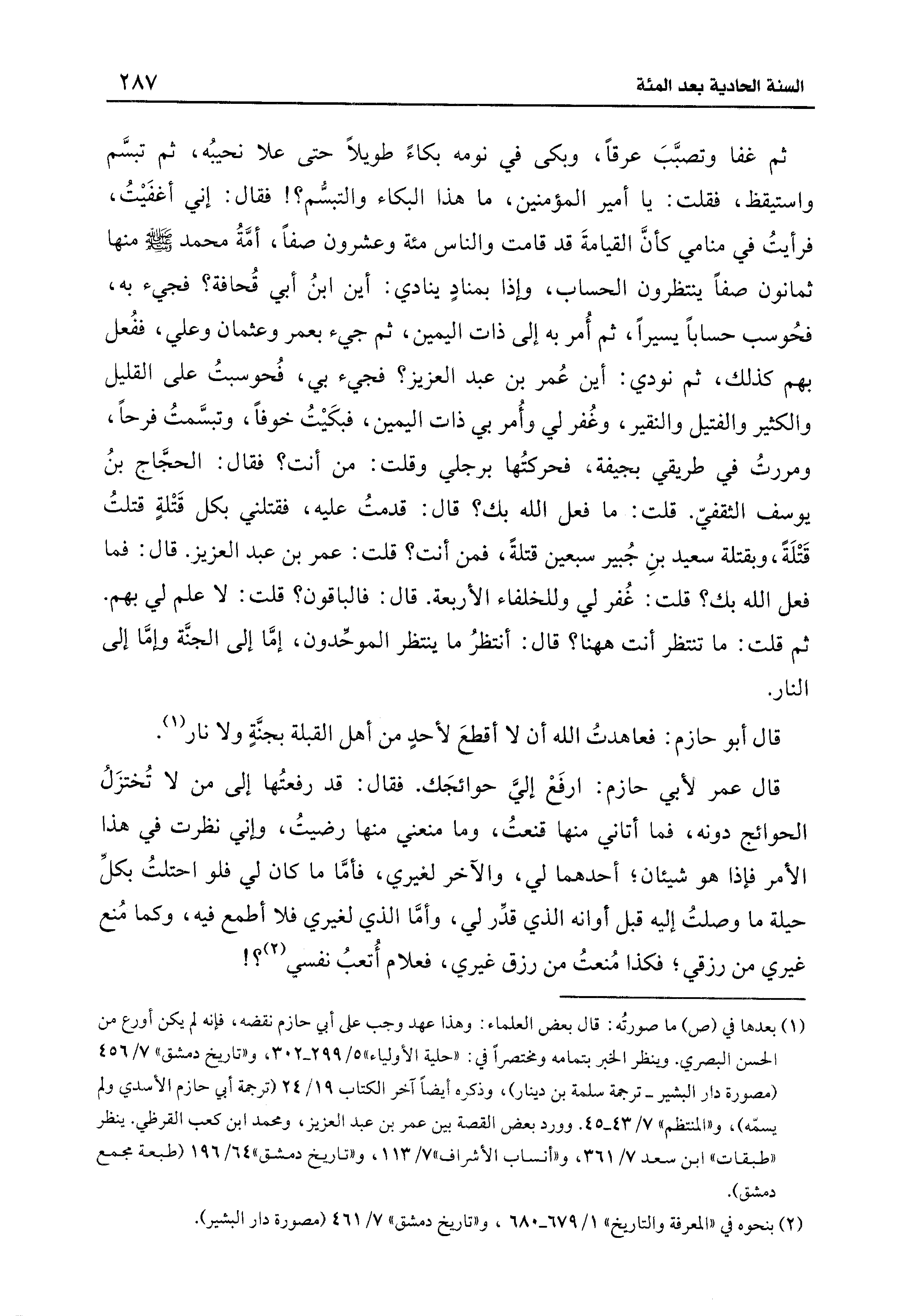 ثم غفا وتصبَّبَ عرقًا، وبكى في نومه بكاءً طويلًا حتَّى علا نحيبُه، ثم تبسَّم واستيقظ، فقلت: يا أمير المؤمنين، ما هذا البكاء والتبسُّم؟ ! فقال: إني أغفَيتُ، فرأيتُ في منامي كأنَّ القيامةَ قد قامت والناس مئة وعشرون صفًّا، أمَّةُ محمد - صلى الله عليه وسلم - منها ثمانون صفًّا ينتظرون الحساب، وإذا بمنادٍ ينادي: أين ابنُ أبي قُحافة؟ فجيء به، فحُوسب حسابًا يسيرًا، ثم أُمر به إلى ذات اليمين، ثم جيء بعمر وعثمان وعلي، ففُعل بهم كذلك، ثم نودي: أين عُمر بن عبد العزيز؛ فجيء بي، فُحوسبتُ على القليل والكثير والفتيل والنقير، وغُفر لي وأُمر بي ذات اليمين، فبكَيتُ خوفًا، وتبسَّمتُ فرحًا، ومررتُ في طريقي بجيفة؛ فحركتُها برجلي وقلت: من أنت؟ فقال: الحجَّاج بنُ يوسف الثقفيّ. قلت: ما فعل الله بك؟ قال: قدمتُ عليه، فقتلني بكل قَتْلةٍ قتلتُ قَتْلَةً، وبقتلة سعيد بنِ جُبير سبعين قتلةً، فمن أنت؟ قلت: عمر بن عبد العزيز. قال: فما فعل الله بك؟ قلت: غُفر لي وللخلفاء الأربعة. قال: فالباقون؟ قلت: لا علم لي بهم. ثم قلت: ما تنتظر أنت ها هنا؟ قال: أنتظرُ ما ينتظر الموحِّدون، إمَّا إلى الجنَّة وإمَّا إلى النار.