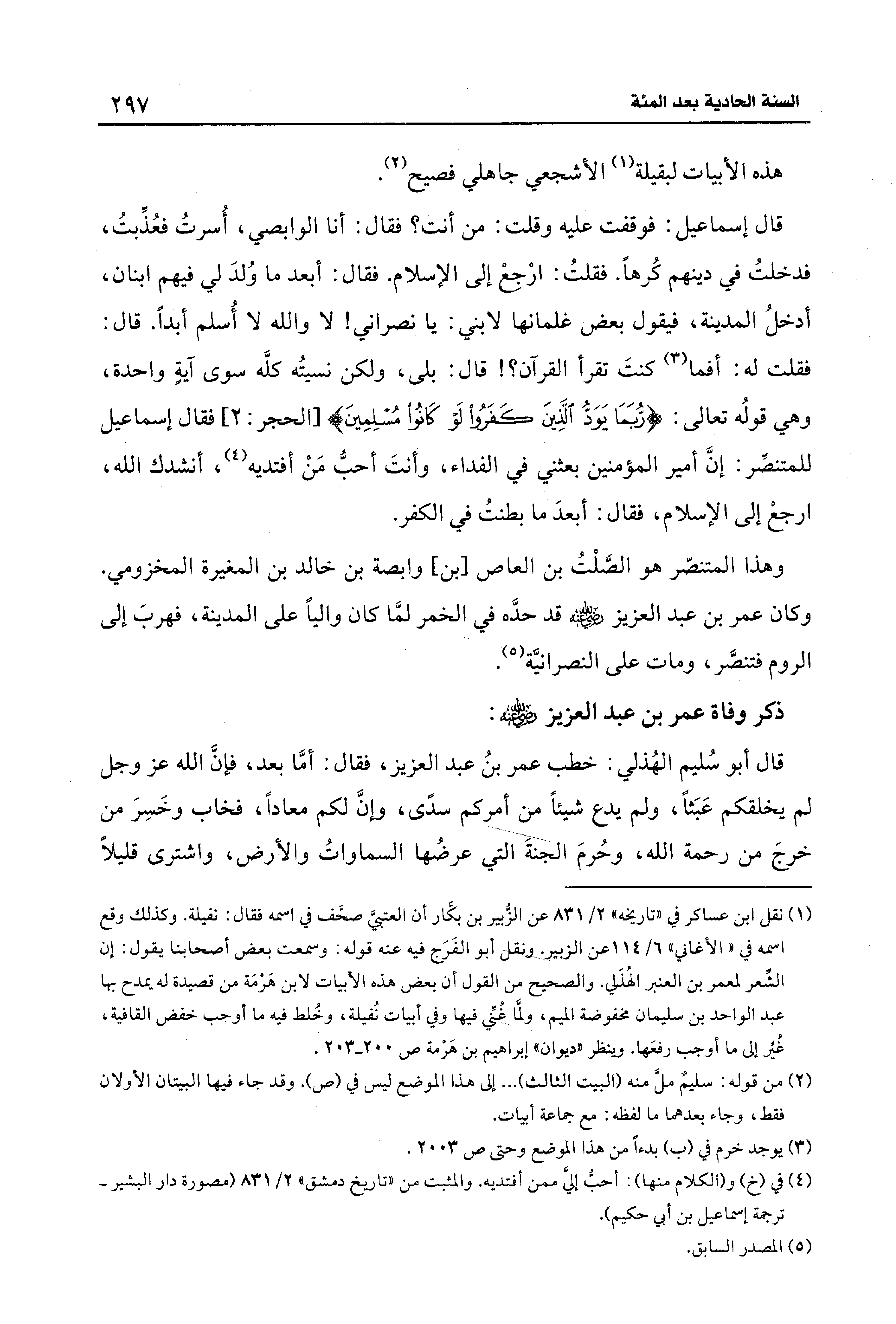 قال إسماعيل: فوقفت عليه وقلت: من أنت؟ فقال: أنا الوابصي، أُسرتُ فعُذِّبتُ، فدخلتُ في دينهم كُرهًا. فقلتُ: ارْجِعْ إلى الإسلام. فقال: أبعد ما وُلدَ لي فيهم ابنان، أدخلُ المدينة، فيقول بعض غلمانها لابني: يا نصراني! لا والله لا أُسلم أبدًا. قال: فقلت له: أفما (¬3) كنتَ تقرأ القرآن؛ ! قال: بلى، ولكن نسيتُه كلَّه سوى آيةٍ واحدة، وهي قولُه تعالى: {رُبَمَا يَوَدُّ الَّذِينَ كَفَرُوا لَوْ كَانُوا مُسْلِمِينَ} [الحجر: 2] فقال إسماعيل للمتنصِّر: إنَّ أمير المؤمنين بعثني في الفداء، وأنتَ أحبُّ مَنْ أفتديه (¬4)، أنشدك الله، ارجعْ إلى الإسلام، فقال: أبعدَ ما بطنتُ في الكفر.