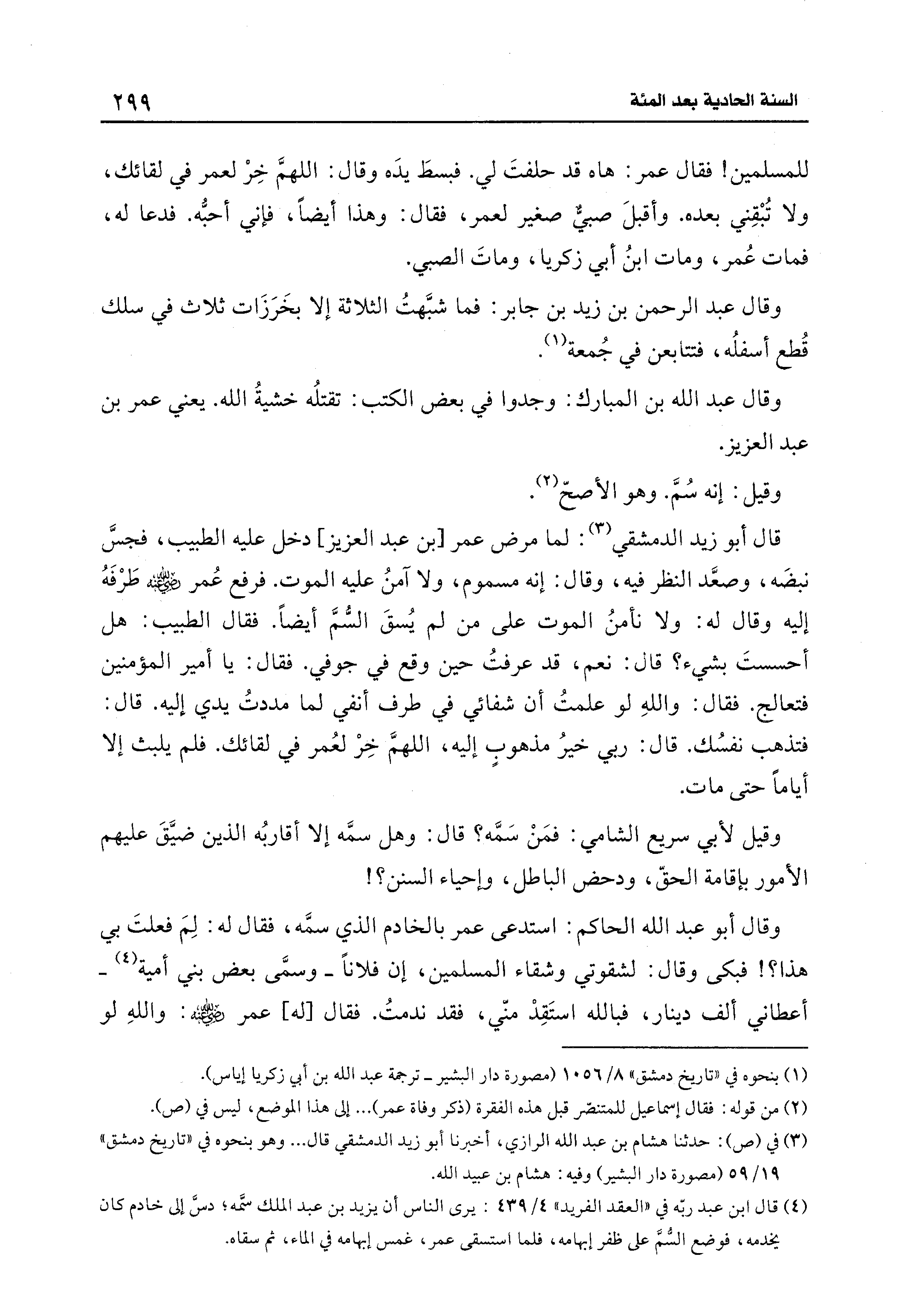 (¬4) قال ابن عبد ربّه في "العقد الفريد" 4/ 439: يرى الناس أن يزيد بن عبد الملك سمَّه؛ دسَّ إلى خادم كان يخدمه، فوضع السُّمَّ على ظفر إبهامه، فلما استسقى عمر، غمس إبهامه في الماء، ثم سقاه.