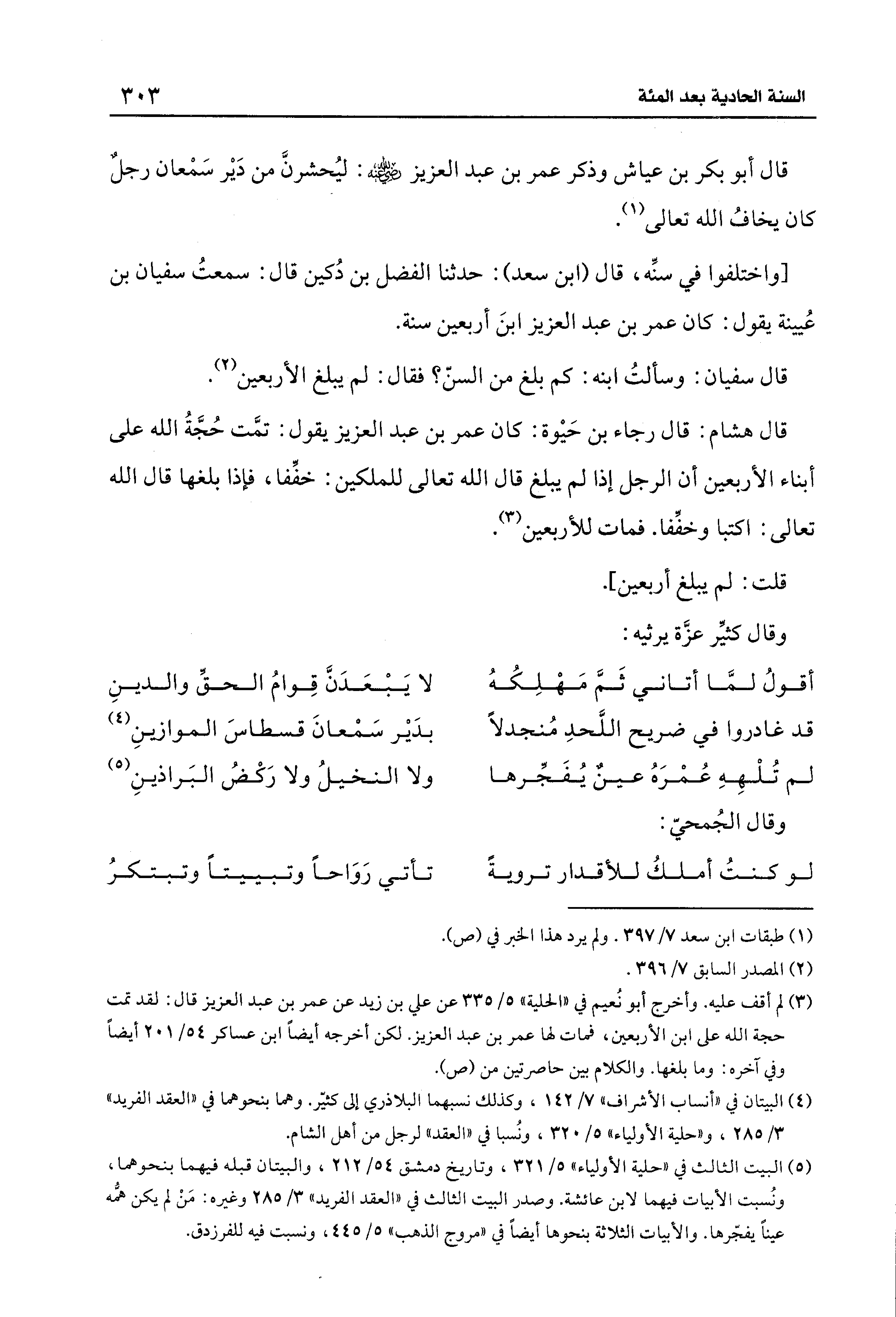 [واختلفوا في سنِّه، قال (ابن سعد): حدثنا الفضل بن دُكين قال: سمعتُ سفيان بن عُيينة يقول: كان عمر بن عبد العزيز ابنَ أربعين سنة.