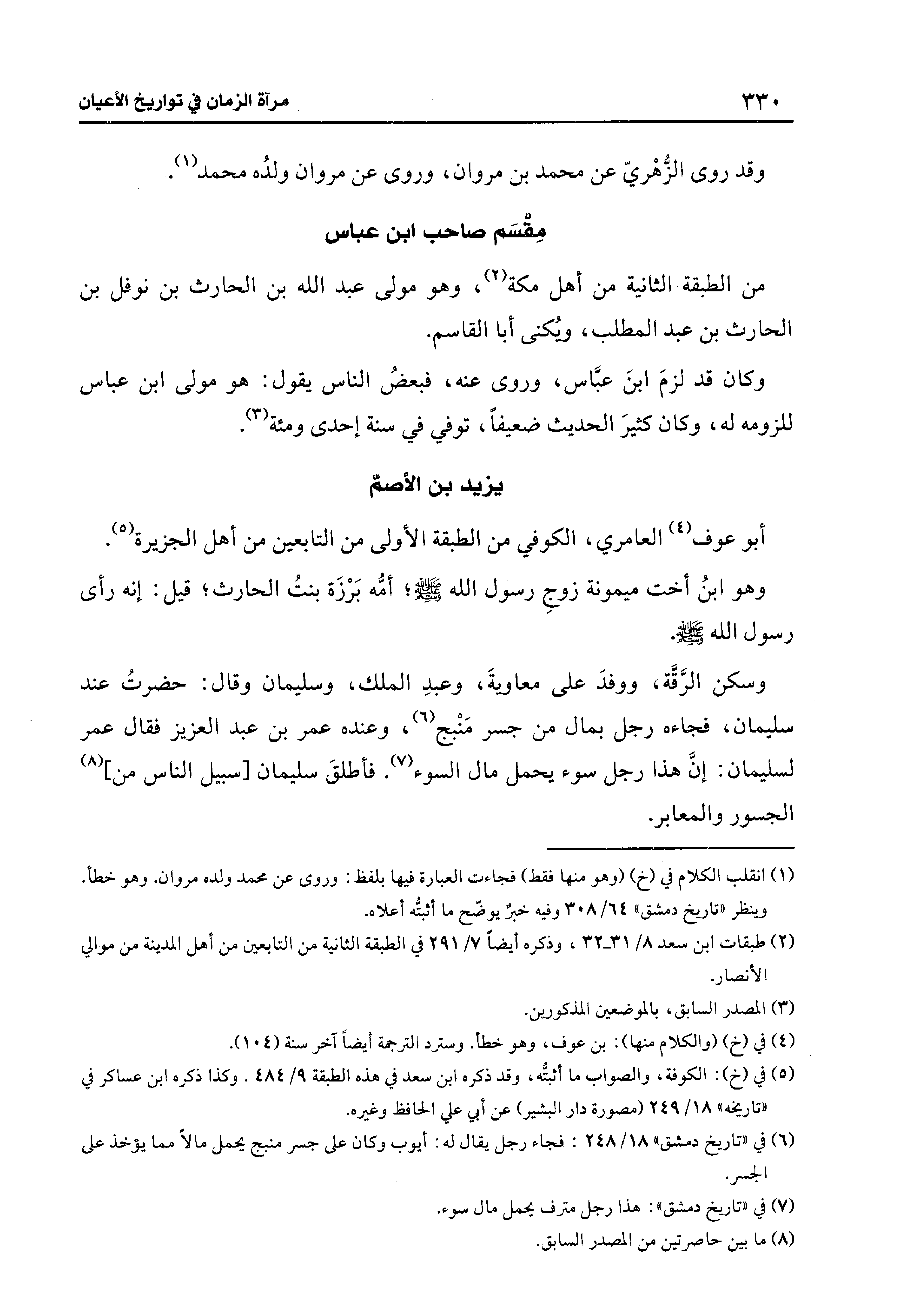 وسكن الرَّقَّة، ووفدَ على معاويةَ، وعبدِ الملك، وسليمان وقال: حضرتُ عند سليمان، فجاءه رجل بمال من جسر مَنْبج (¬6)، وعنده عمر بن عبد العزيز فقال عمر لسليمان: إنَّ هذا رجل سوء يحمل مال السوء (¬7). فأطلقَ سليمان [سبيل النَّاس من] (¬8) الجسور والمعابر.