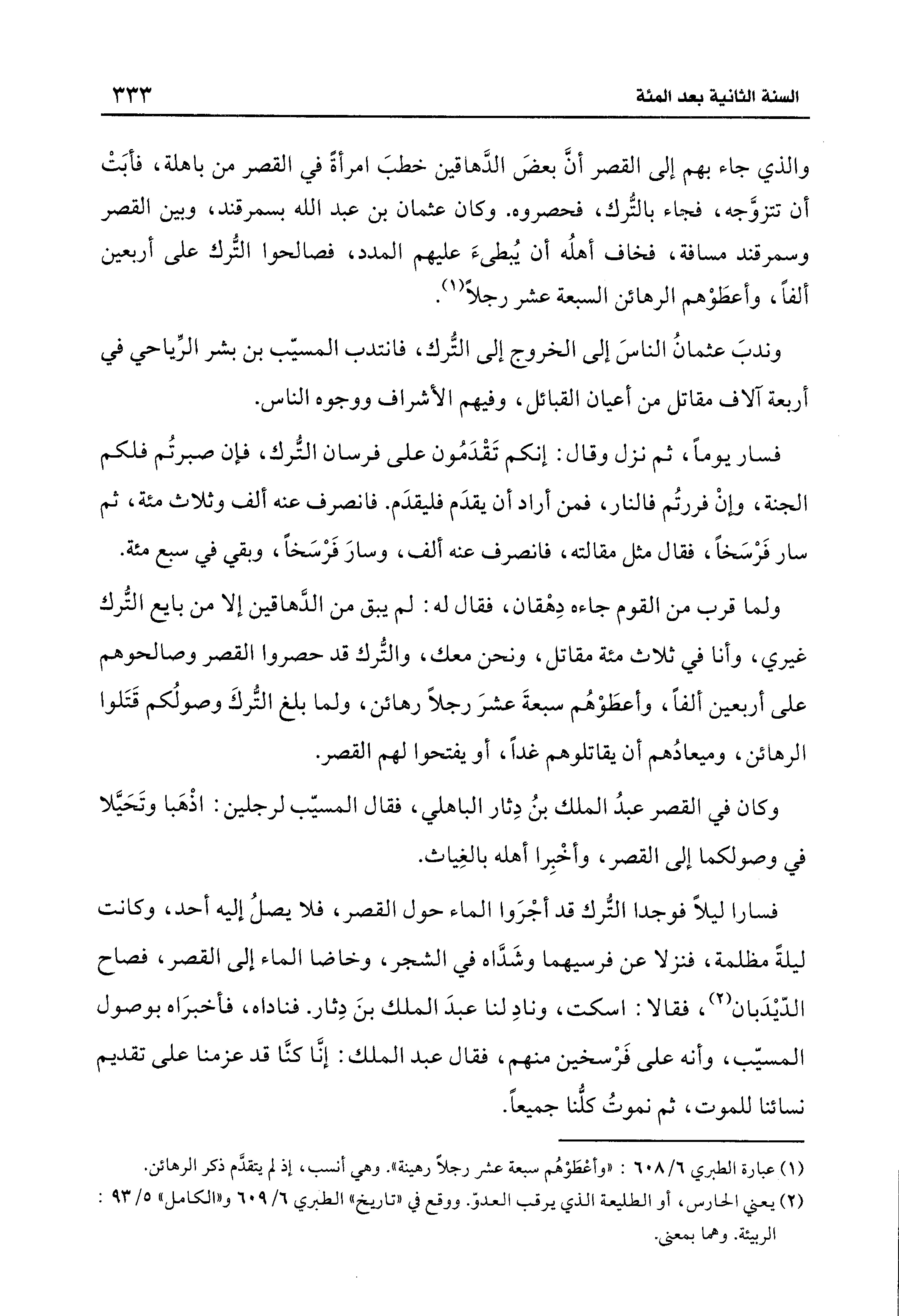 ولما قرب من القوم جاءه دِهْقان، فقال له: لم يبق من الدَّهاقين إلَّا من بايع التُّرك غيري، وأنا في ثلاث مئة مقاتل، ونحن معك، والتُّرك قد حصروا القصر وصالحوهم على أربعين ألفًا، وأعطَوْهُم سبعةَ عشرَ رجلًا رهائن، ولما بلغ التُّركَ وصولُكم قَتَلوا الرهائن، وميعادُهم أن يقاتلوهم غدًا، أو يفتحوا لهم القصر.