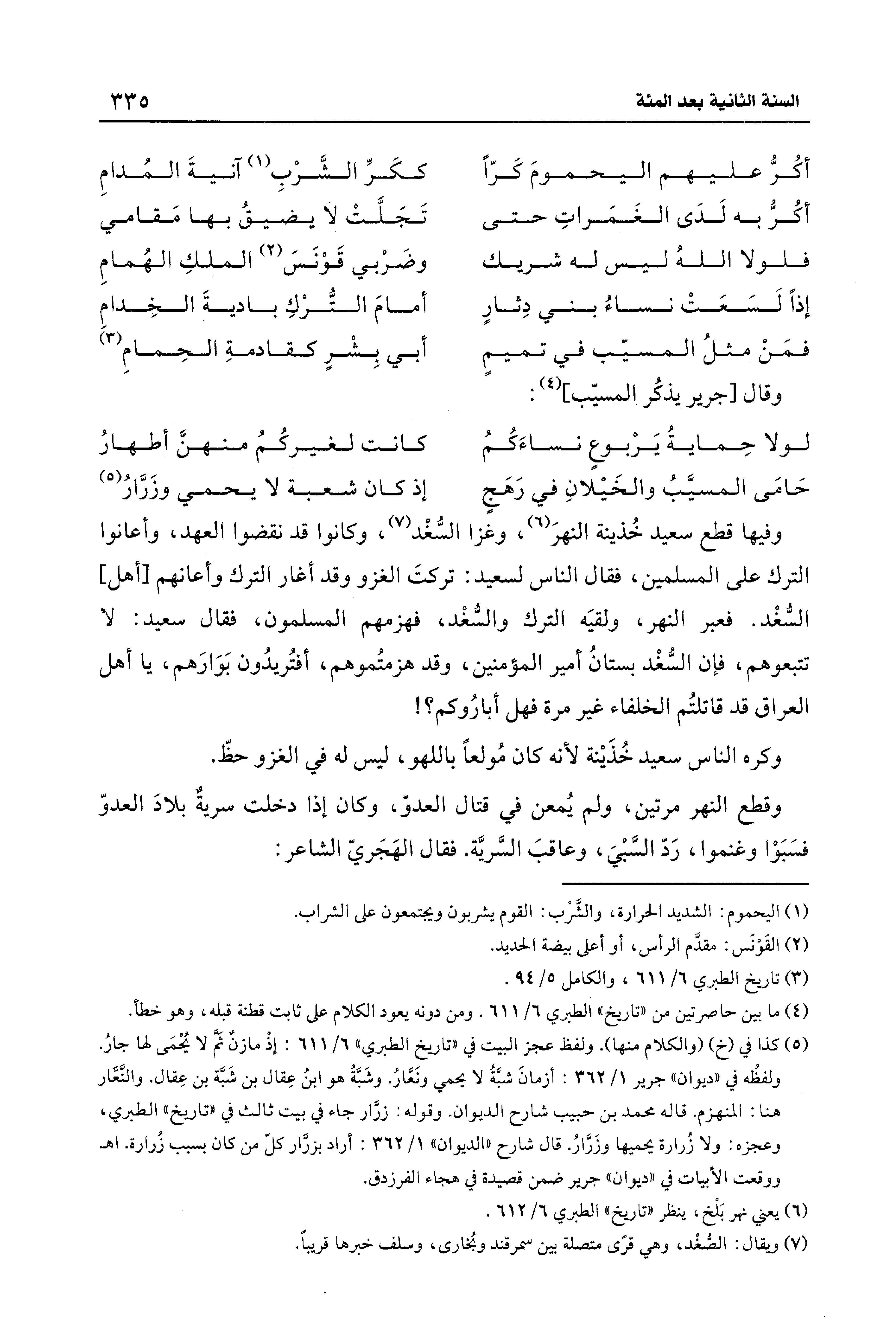 (¬5) كذا في (خ) (والكلام منها). ولفظ عجز البيت في "تاريخ الطبري" 6/ 611: إذْ مازنٌ ثَمَّ لا يُحْمَى لها جارُ. ولفظُه في "ديوان" جرير 1/ 362: أزمانَ شبَّةُ لا يحمي ونَعَّارُ. وشَبَّةُ هو ابنُ عِقال بن شَبَّة بن عِقال. والنَعَّار هنا: المنهزم. قاله محمَّد بن حبيب شارح الديوان. وقوله: زرَّار جاء في بيت ثالث في "تاريخ" الطبري، وعجزه: ولا زُرارة يحميها وزَرَّارُ. قال شارح "الديوان" 1/ 362: أراد بزرَّار كل من كان بسبب زُرارة. اهـ. ووقعت الأبيات في "ديوان" جرير ضمن قصيدة في هجاء الفرزدق.