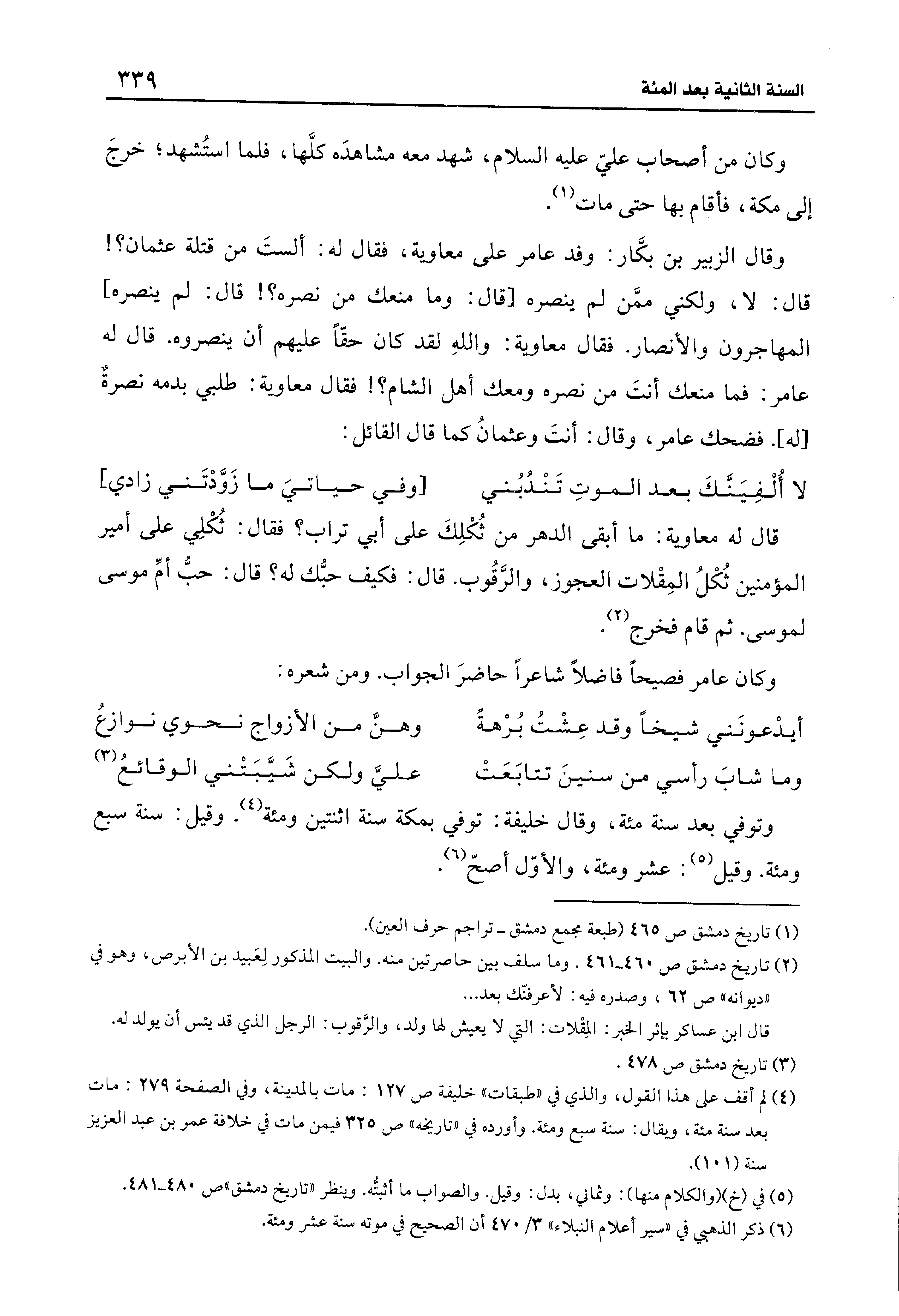 وقال الزبير بن بكَّار: وقد عامر على معاوية، فقال له: ألستَ من قتلة عثمان؟ ! قال: لا, ولكني ممَّن لم ينصره [قال: وما منعك من نصره؟ ! قال: لم ينصره] المهاجرون والأَنْصار. فقال معاوية: واللهِ لقد كان حقًّا عليهم أن ينصروه. قال له عامر: فما منعك أنتَ من نصره ومعك أهل الشام؟ ! فقال معاوية: طلبي بدمه نصرةٌ [له]. فضحك عامر، وقال: أنتَ وعثمانُ كما قال القائل؟