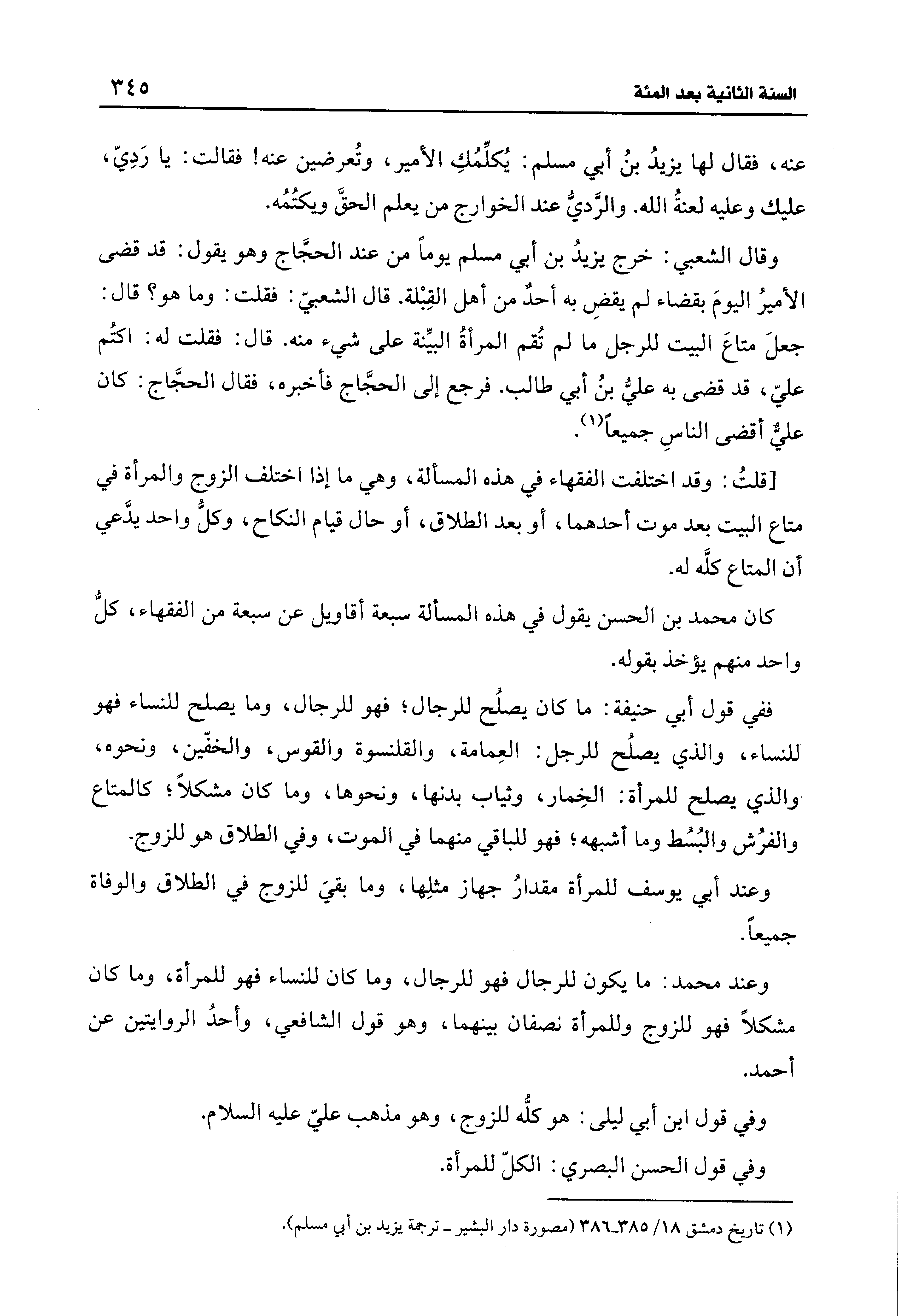 وقال الشعبي: خرج يزيدُ بن أبي مسلم يومًا من عند الحجَّاج وهو يقول: قد قضى الأميرُ اليومَ بقضاء لم يقضِ به أحدٌ من أهل القِبْلة. قال الشعبيّ: فقلت: وما هو؟ قال: جعلَ متاعَ البيت للرجل ما لم تُقم المرأةُ البيّنة على شيء منه. قال: فقلت له: اكتُم عليّ، قد قضى به عليُّ بنُ أبي طالب. فرجع إلى الحجَّاج فأخبره، فقال الحجَّاج: كان عليٌّ أقضى الناسِ جميعًا (¬1).