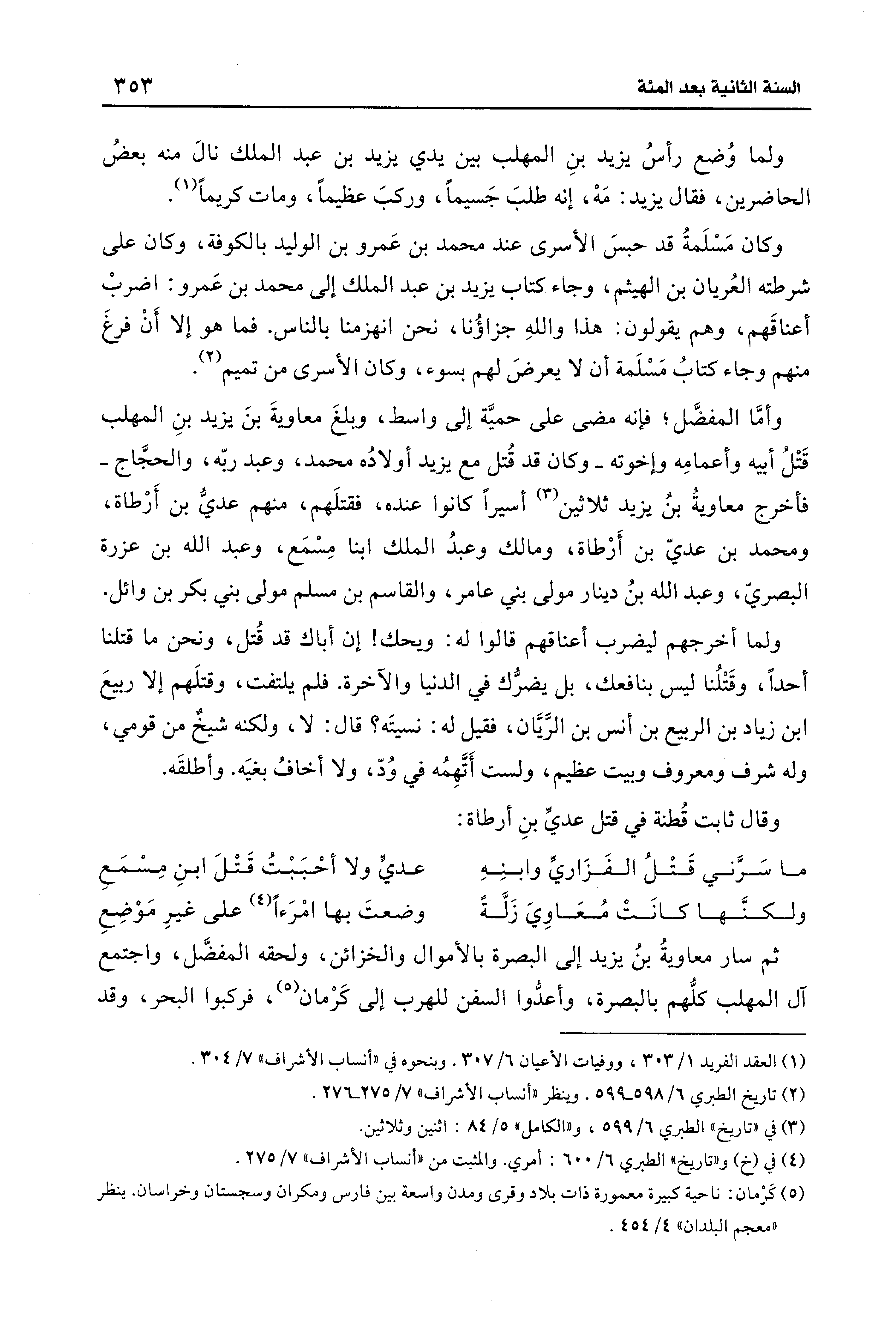 وأمَّا المفضَّل؛ فإنَّه مضى على حميَّة إلى واسط، وبلغَ معاويةَ بنَ يزيد بنِ المهلب قَتْلُ أَبيه وأعمامِه وإخوته -وكان قد قُتل مع يزيد أولادُه محمَّد، وعبد ربّه، والحجَّاج- فأخرج معاوية بن يزيد ثلاثين (¬3) أسيرًا كانوا عنده، فقتلَهم، منهم عديُّ بن أَرْطاة، ومحمَّد بن عديّ بن أَرْطاة، ومالك وعبدُ الملك ابنا مِسْمَع، وعبد الله بن عزرة البصريّ، وعبد الله بنُ دينار مولى بني عامر، والقاسم بن مسلم مولى بني بكر بن وائل.