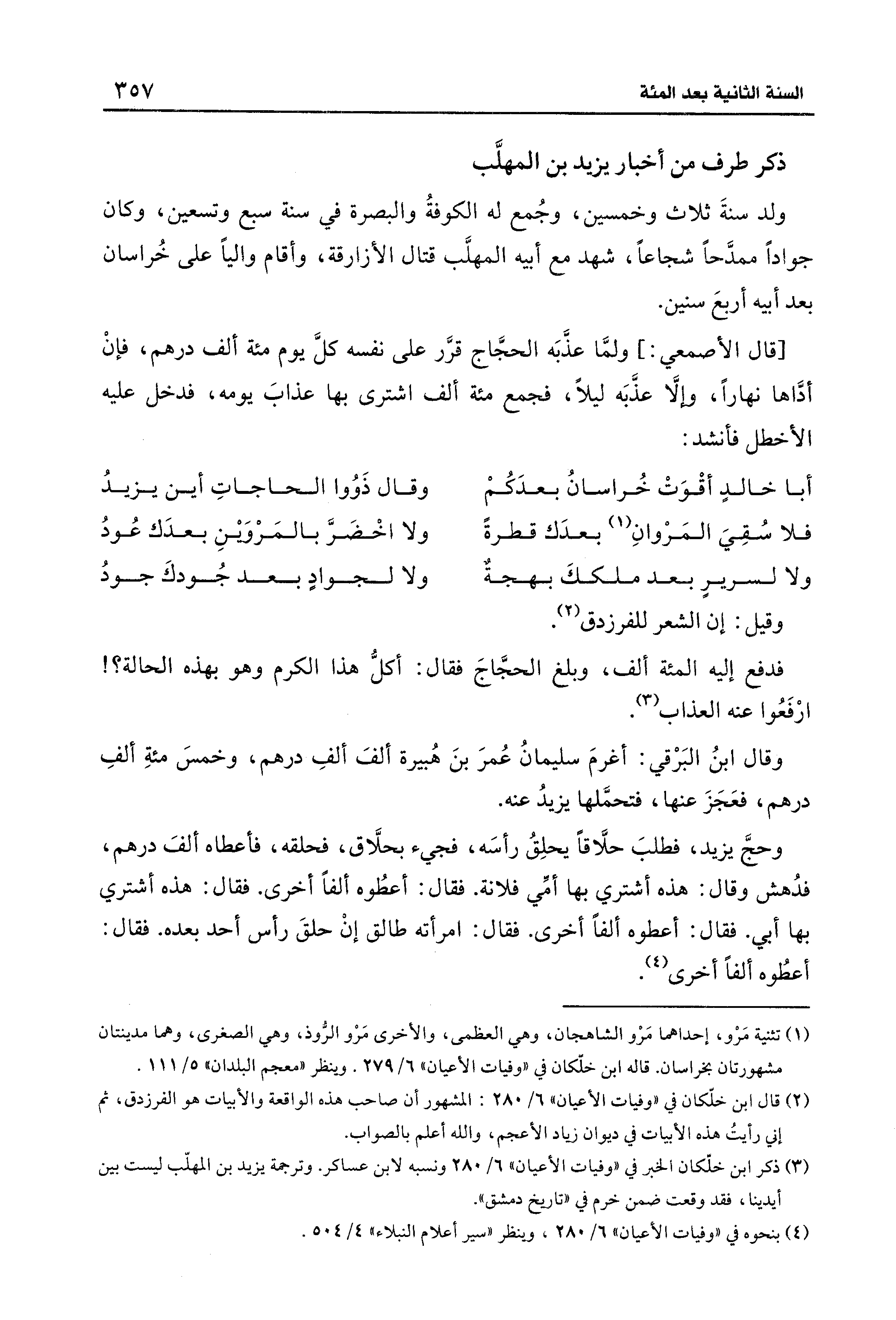 (¬3) ذكر ابن خلّكان الخبر في "وفيات الأعيان" 6/ 280 ونسبه لابن عساكر. وترجمة يزيد بن المهلّب ليست بين أيدينا، فقد وقعت ضمن خرم في "تاريخ دمشق".