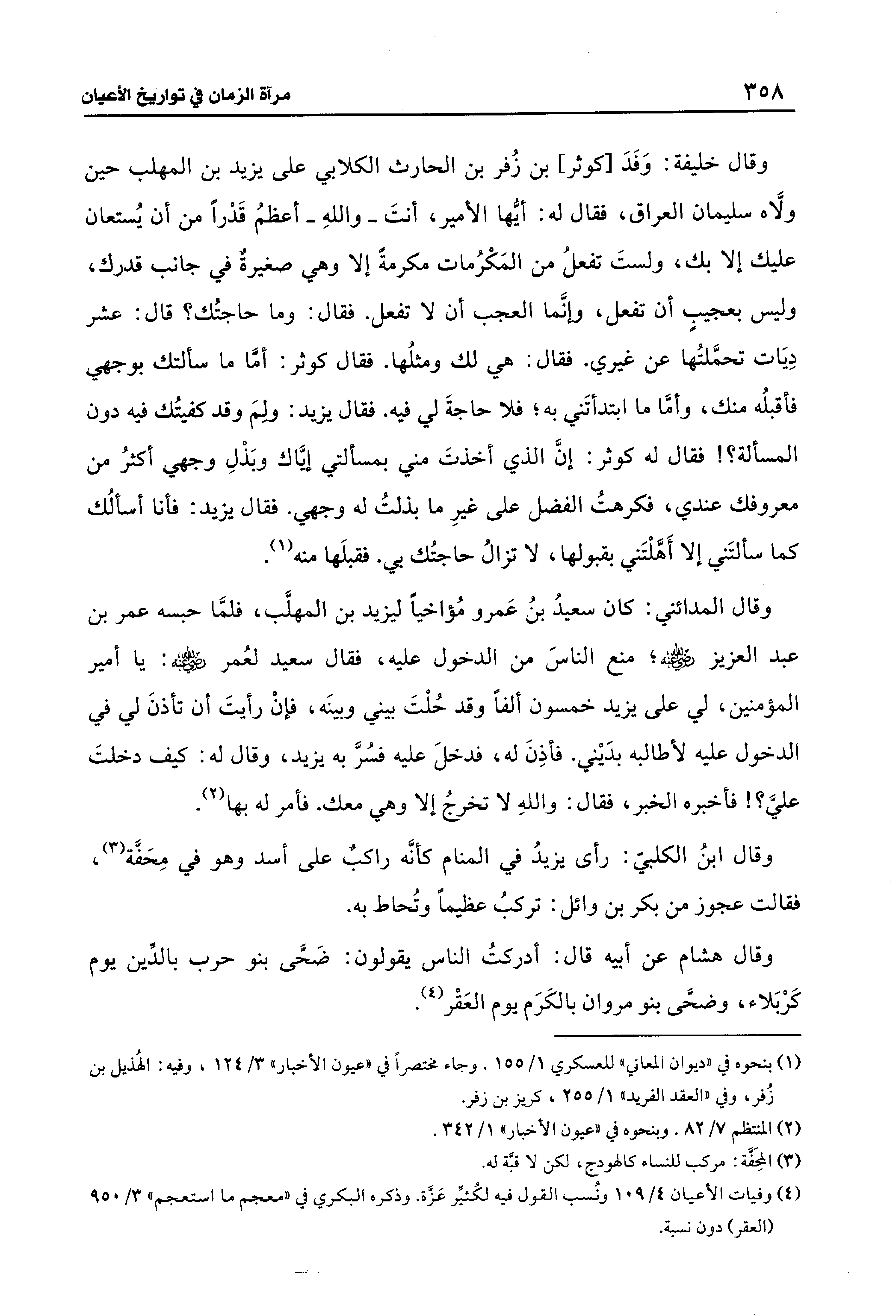 وقال خليفة: وَفَدَ [كوثر] بن زُفر بن الحارث الكلابي على يزيد بن المهلب حين ولَّاه سليمان العراق، فقال له: أيُّها الأمير، أنتَ - واللهِ - أعظمُ قَدْرًا من أن يُستعان عليك إلا بك، ولستَ تفعلُ من المَكْرُمات مكرمةً إلا وهي صغيرةٌ في جانب قدرك، وليس بعجيبٍ أن تفعل، وإنَّما العجب أن لا تفعل. فقال: وما حاجتُك؟ قال: عشر دِيَات تحمَّلتُها عن غيري. فقال: هي لك ومثلُها. فقال كوثر: أما ما سألتك بوجهي فأقبلُه منك، وأمَّا ما ابتدأتَني به؛ فلا حاجةَ لي فيه. فقال يزيد: ولمَ وقد كفيتُك فيه دون المسألة؟ ! فقال له كوثر: إنَّ الذي أخذتَ مني بمسألتي ايَّاك وبَذْلِ وجهي أكثرُ من معروفك عندي، فكرهتُ الفضل على غيرِ ما بذلتُ له وجهي. فقال يزيد: فأنا أسألُك كما سألتَني إلا أَهَّلْتَني بقبولها، لا تزالُ حاجتُك بي. فقبلَها منه (¬1).