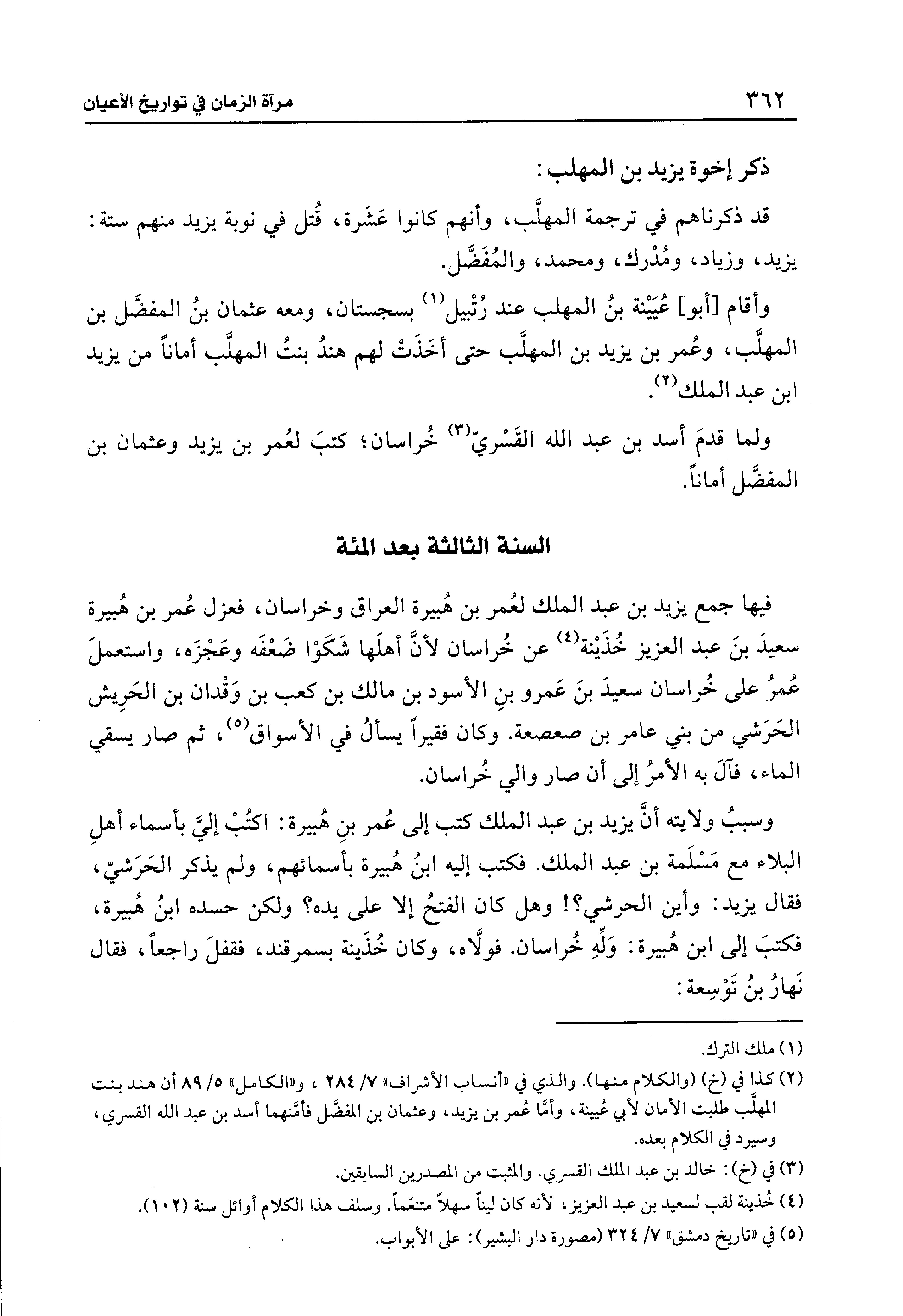 فيها جمع يزيد بن عبد الملك لعُمر بن هُبيرة العراق وخراسان، فعزل عُمر بن هُبيرة سعيدَ بنَ عبد العزيز خُذَينة (¬4) عن خُراسان لأنَّ أهلَها شَكَوْا ضَعْفَه وعَجْزَه، واستعملَ عُمرُ على خُراسان سعيدَ بنَ عَمرو بنِ الأسود بن مالك بن كعب بن وَقْدان بن الحَرِيش الحَرَشي من بني عامر بن صعصعة. وكان فقيرًا يسألُ في الأسواق (¬5)، ثم صار يسقي الماء، فآلَ به الأمرُ إلى أن صار والي خُراسان.