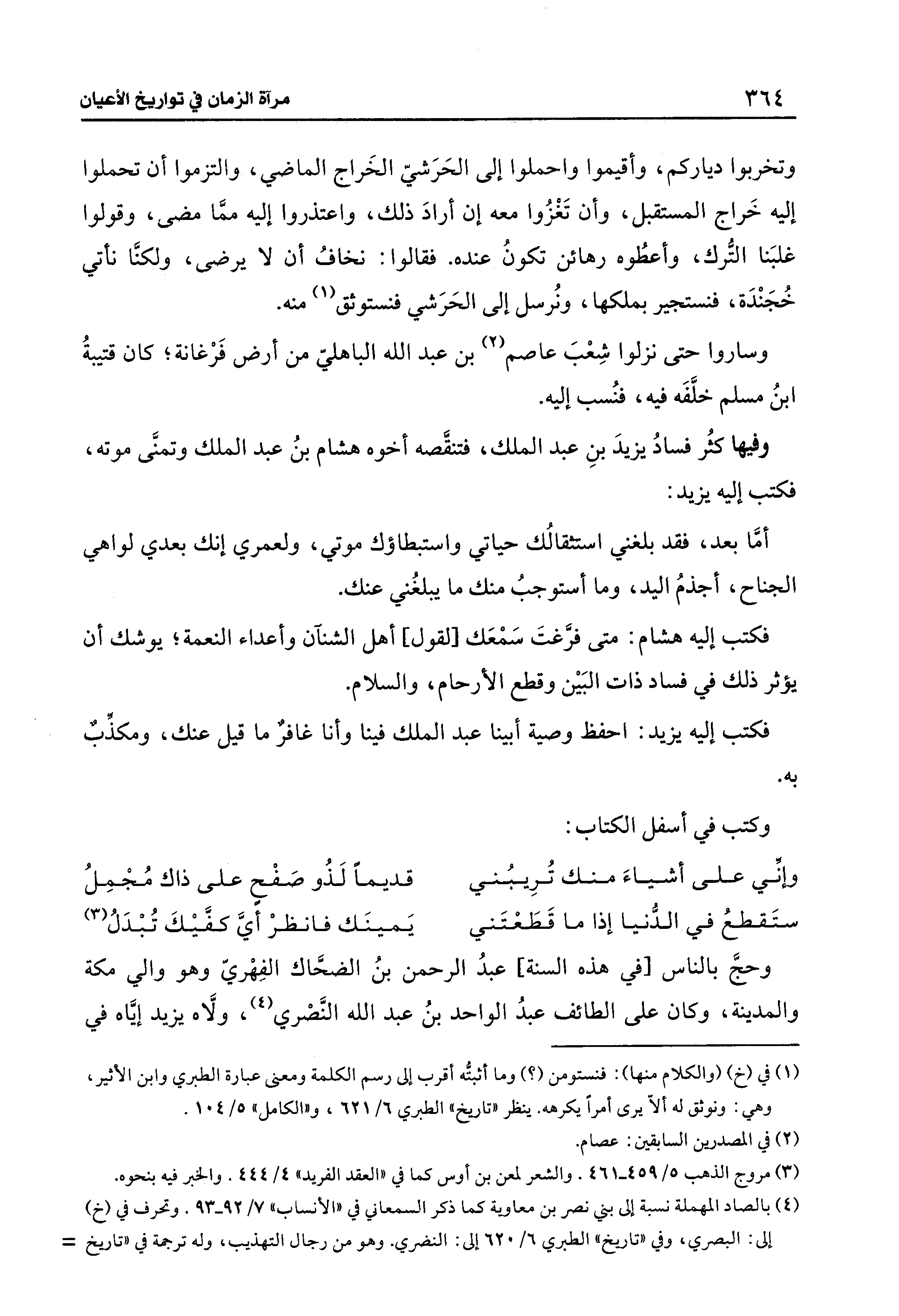 وفيها كثُر فسادُ يزيدَ بنِ عبد الملك، فتنقَّصه أخوه هشام بنُ عبد الملك وتمنَّى موته، فكتب إليه يزيد: